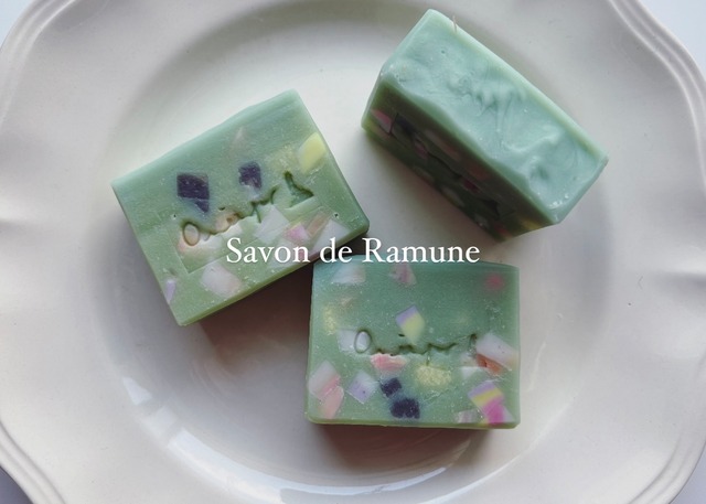 ラムネ石鹸 【Savon de Ramune】 Ramune Soap ◆特徴 昭和の夏、駄菓子屋の軒先でビー玉入りの瓶をポンと開けた瞬間―― きらきら弾ける泡と、胸いっぱいに広がるあの甘酸っぱい記憶を石鹸に閉じ込めました。 透き通るような爽やかさと、ほんのり懐かしい温もりを感じる特別な一品です。 ◆香り ベースは落ち着きのあるサンダルウッド。 そこに5種類以上の繊細な香りが重なり合い、 ラムネのように奥深く、どこか遊び心のある贅沢な香りに仕上げました。 洗うたび、心までふっと軽くなるような香りのハーモニーをお楽しみください。 ◆原材料 オリーブオイル、ココナッツオイル、パームオイル、ツバキオイル、ゴールデンホホバオイル、アルガンオイル、カレンデュラオイル、アボカドオイル、ヒマシオイル、ウチワサボテンオイル、マルラオイル、ライスブランオイル、水酸化ナトリウム、精製水、アロマオイル(サンダルウッド)ソープエンド、マイカ(グリーン、スパークリングブルー) ◆内容量 個数 : 1個 重量 : 85g前後 ◆お手入れの目安 石鹸は湿気に弱いため、 ご使用の際はなるべく乾いた状態を保つことで長くお楽しみいただけます。 水分がつくと柔らかくなる場合がありますので、 風通しのよい場所での保管をおすすめしています。 ◆手作り石鹼 合成界面活性剤、鉱物油、保存料、防腐剤、合成香料、アルコール一切不使用。 全てコールドプロセス・枠練り製法の手作り石鹼のため、色や形が写真と全く同じにはなりませんのでご了承ください。 ◆ご購入前のご確認 こちらの石鹸は薬事法上、雑貨として販売しております。化粧品・医薬品・医薬部外品のいずれにも該当しません。 自身で使用し問題ない品を販売しておりますが、ご購入者様のご使用に際してのトラブルには責任を負いかねますことあらかじめご了承願います。