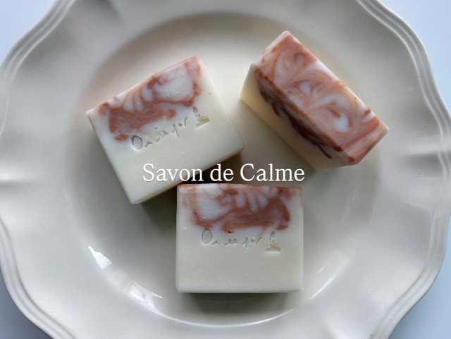カルム石鹸 【Savon de Calme】 Murumuru Oil Soap ◆ 特徴 南米原産ムルムルオイルを主原料とした雑貨石鹸 ◆香り ゼラニウム×ベルガモット 【柑橘の明るさに、花のやさしさがふわっと重なる香り】 ◆原材料 オリーブオイル、ココナッツオイル、パームオイル、ゴールデンホホバオイル、バオバブオイル、アルガルオイル、ローズヒップオイル、スウィートアーモンドオイル、ヒマシオイル、ツバキオイル、アボカドオイル、カレンデュラオイル、ライスブランオイル、シアバター、ムルムルオイル、精油、水酸化ナトリウム、精製水、米粉(山田錦)、マイカ、 ◆内容量 個数 : 1個 重量 : 85g前後 ◆お手入れの目安 石鹸は湿気に弱いため、 ご使用の際はなるべく乾いた状態を保つことで長くお楽しみいただけます。 水分がつくと柔らかくなる場合がありますので、 風通しのよい場所での保管をおすすめしています。 ◆手作り石鹼 合成界面活性剤、鉱物油、保存料、防腐剤、合成香料、アルコール一切不使用。 全てコールドプロセス・枠練り製法の手作り石鹼のため、色や形が写真と全く同じにはなりませんのでご了承ください。 ◆ご購入前のご確認 こちらの石鹸は薬事法上、雑貨として販売しております。化粧品・医薬品・医薬部外品のいずれにも該当しません。 自身で使用し問題ない品を販売しておりますが、ご購入者様のご使用に際してのトラブルには責任を負いかねますことあらかじめご了承願います。