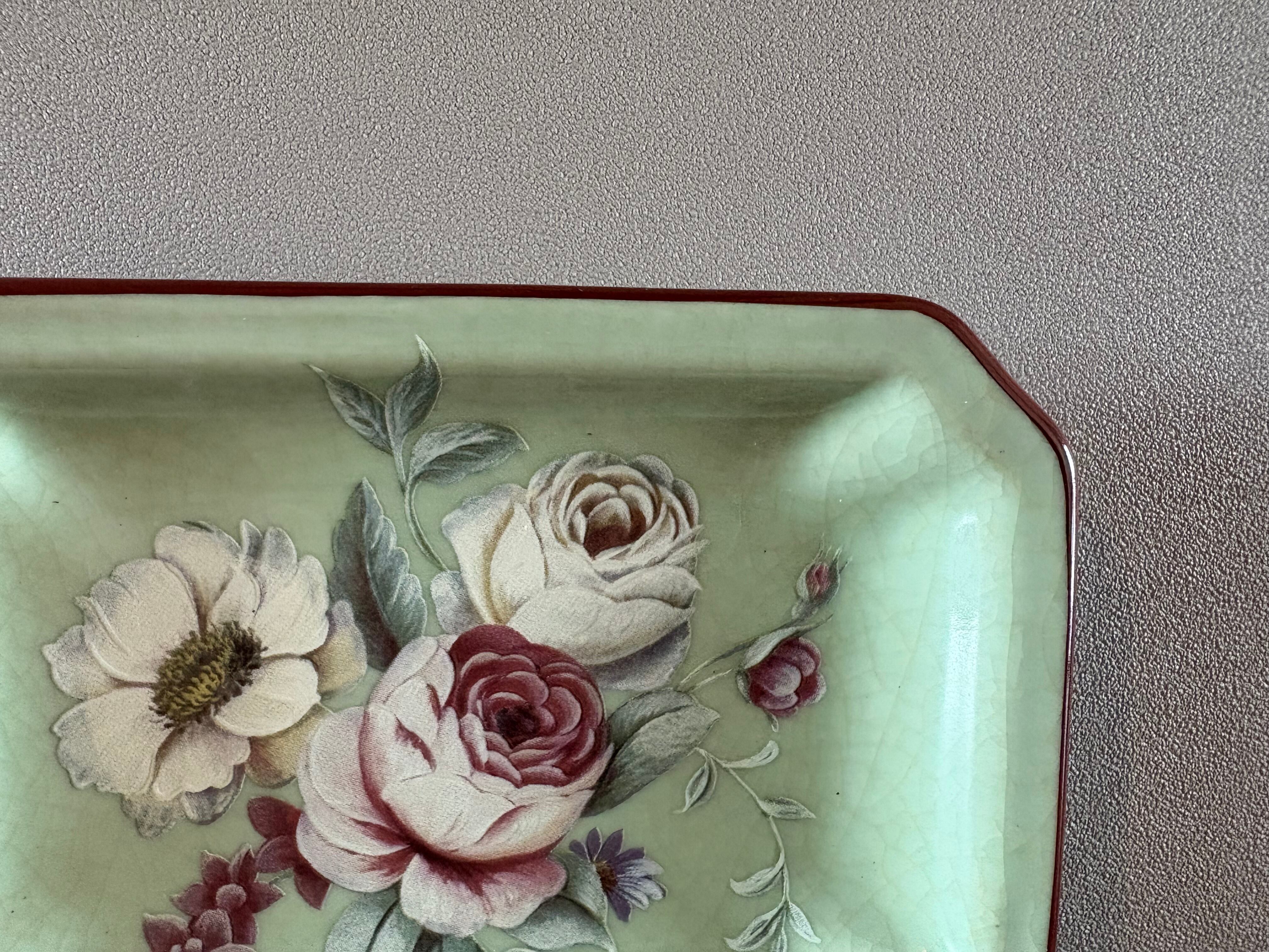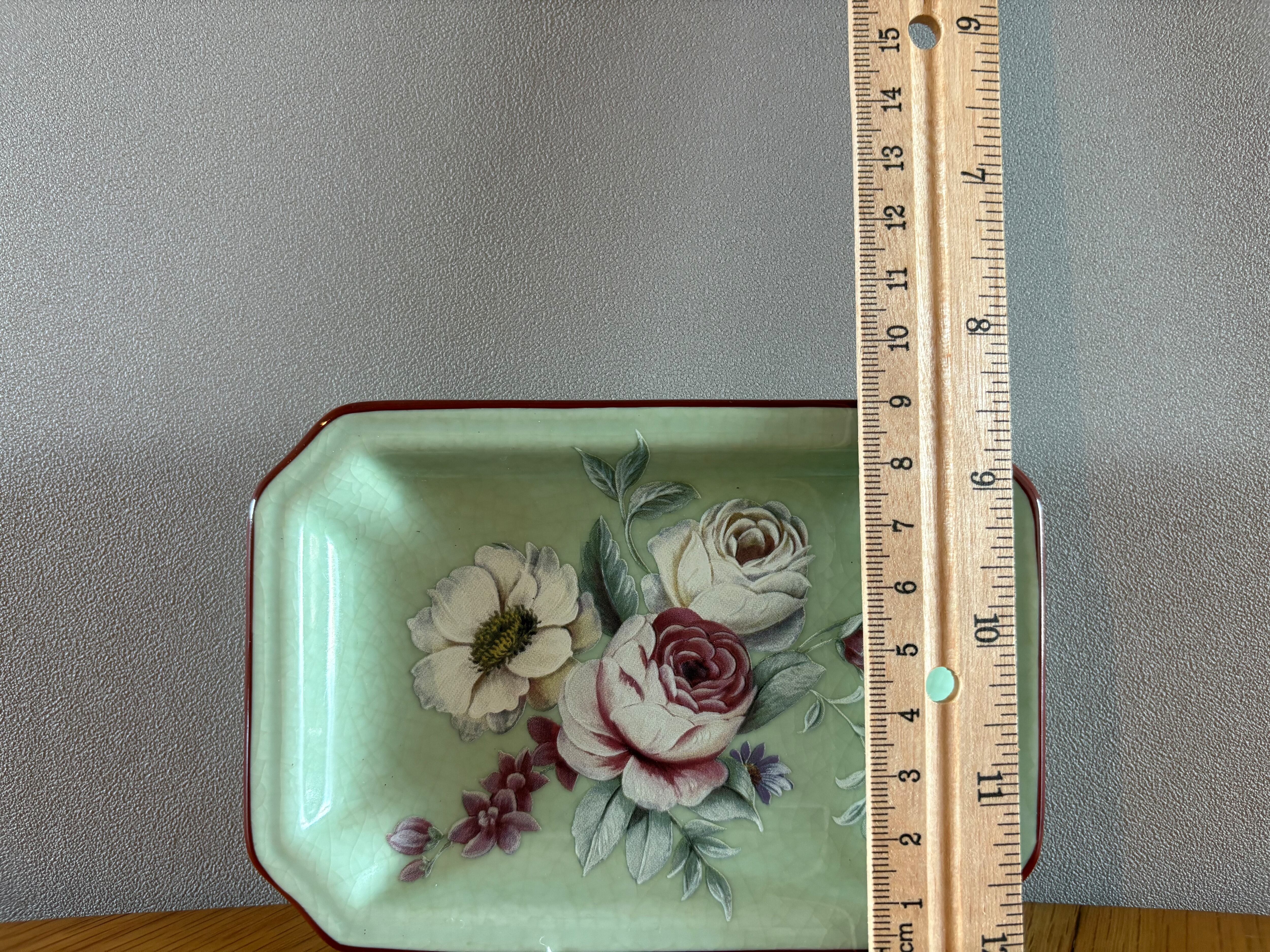 優美なバラの絵柄があしらわれた、ヴィンテージソープディッシュです。優雅な花々が咲き誇る、アンティーク調のレクタングルトレイ。