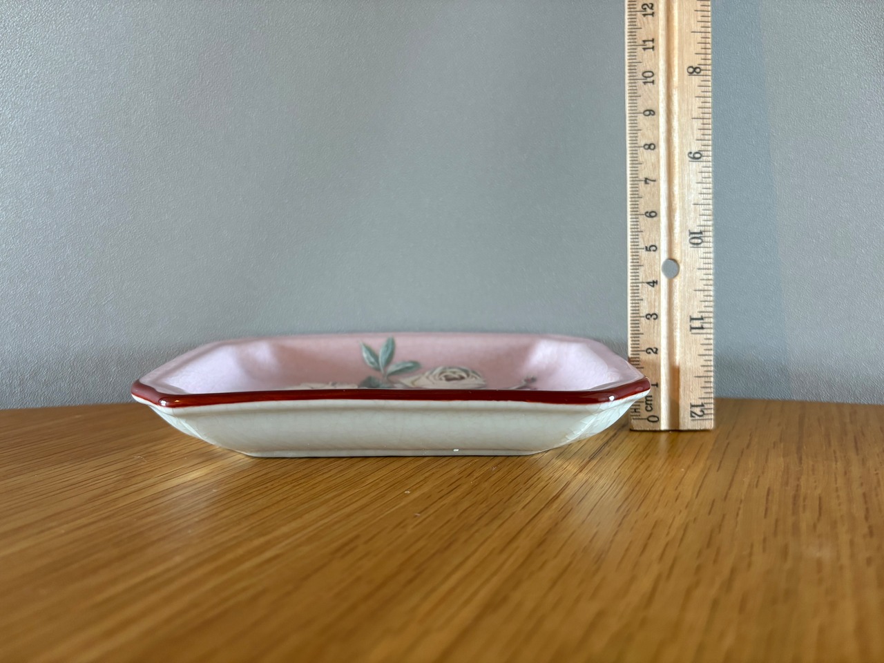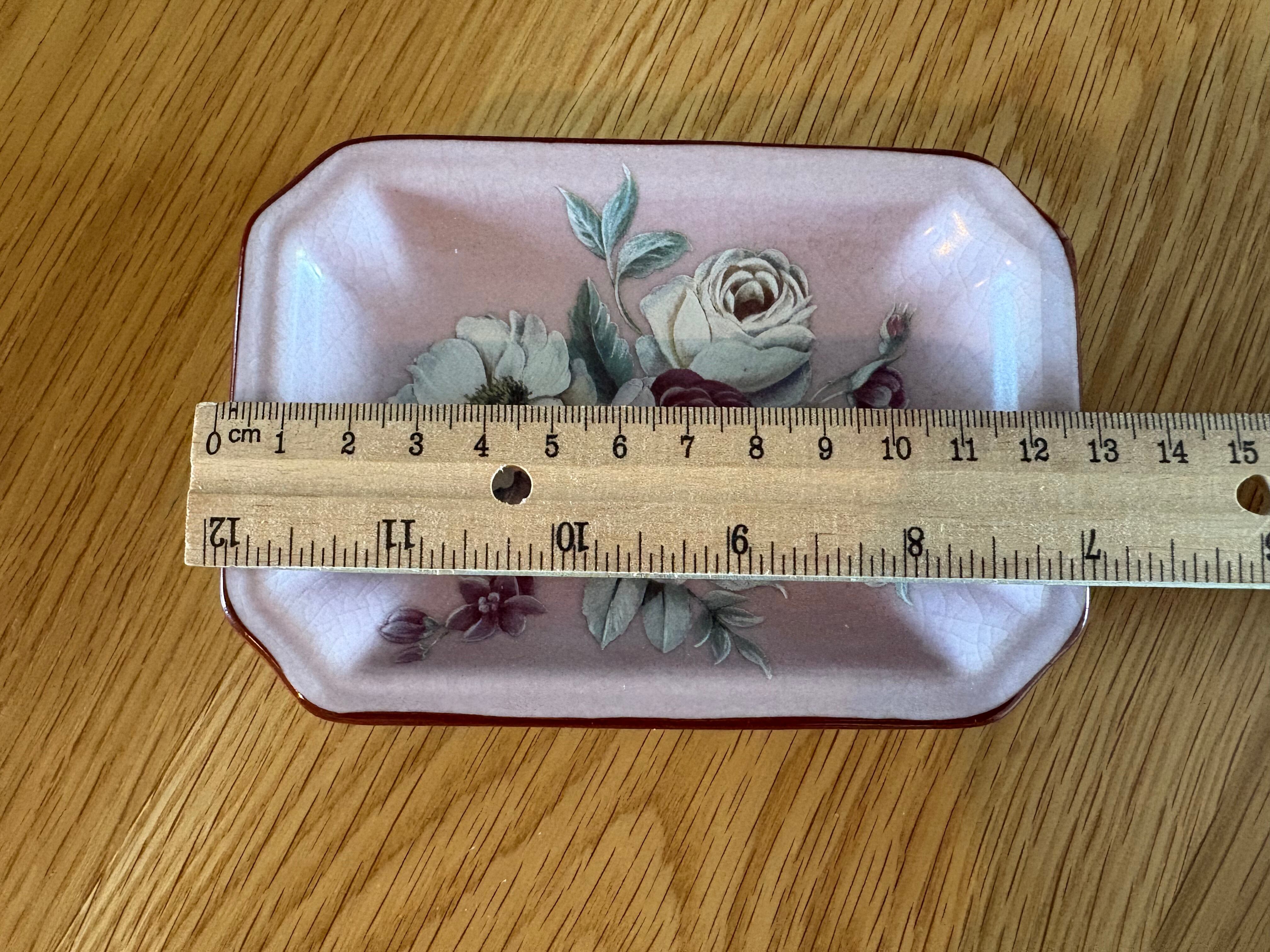 優美なバラの絵柄があしらわれた、ヴィンテージソープディッシュです。優雅な花々が咲き誇る、アンティーク調のレクタングルトレイ。