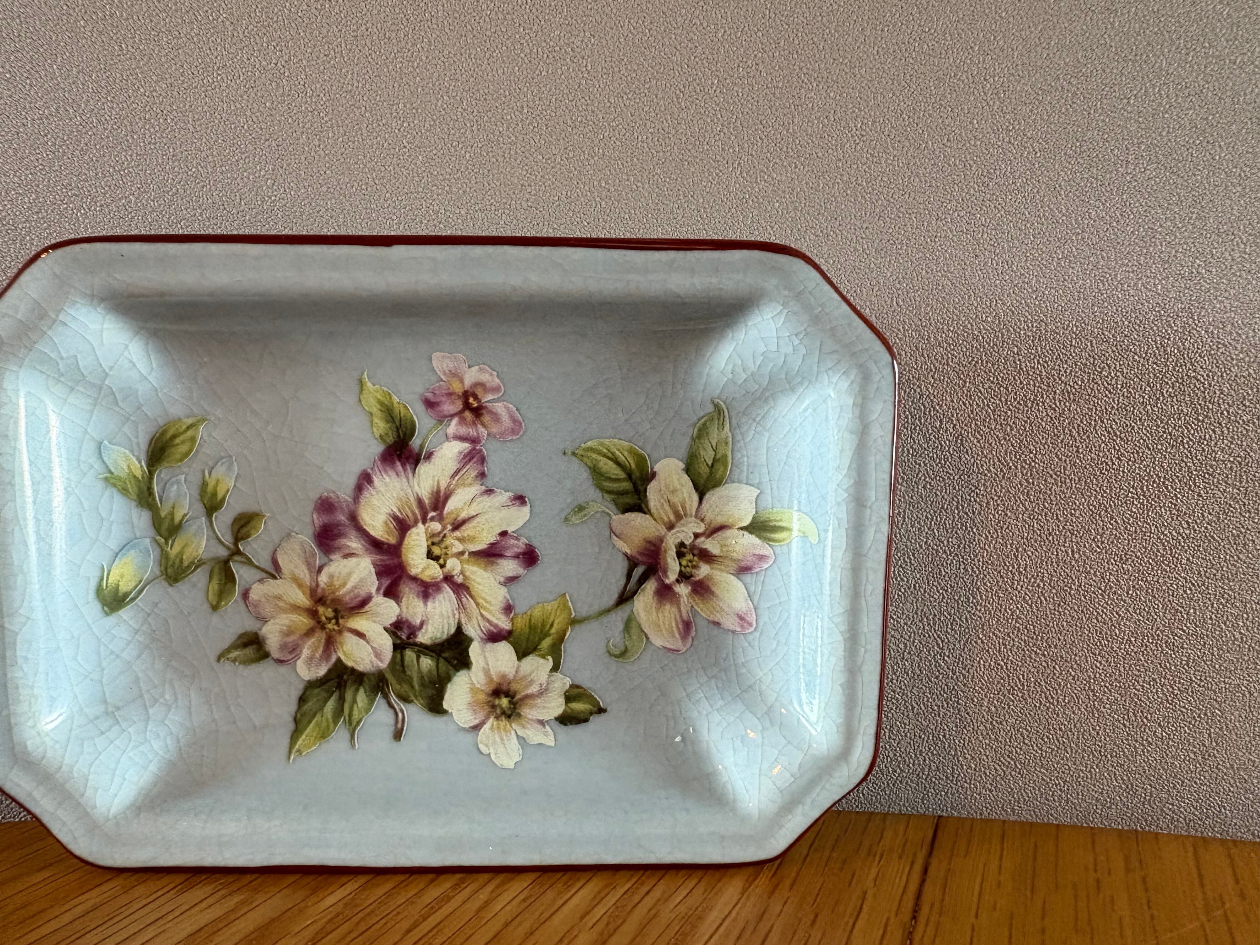 優美なバラの絵柄があしらわれた、ヴィンテージソープディッシュです。優雅な花々が咲き誇る、アンティーク調のレクタングルトレイ。