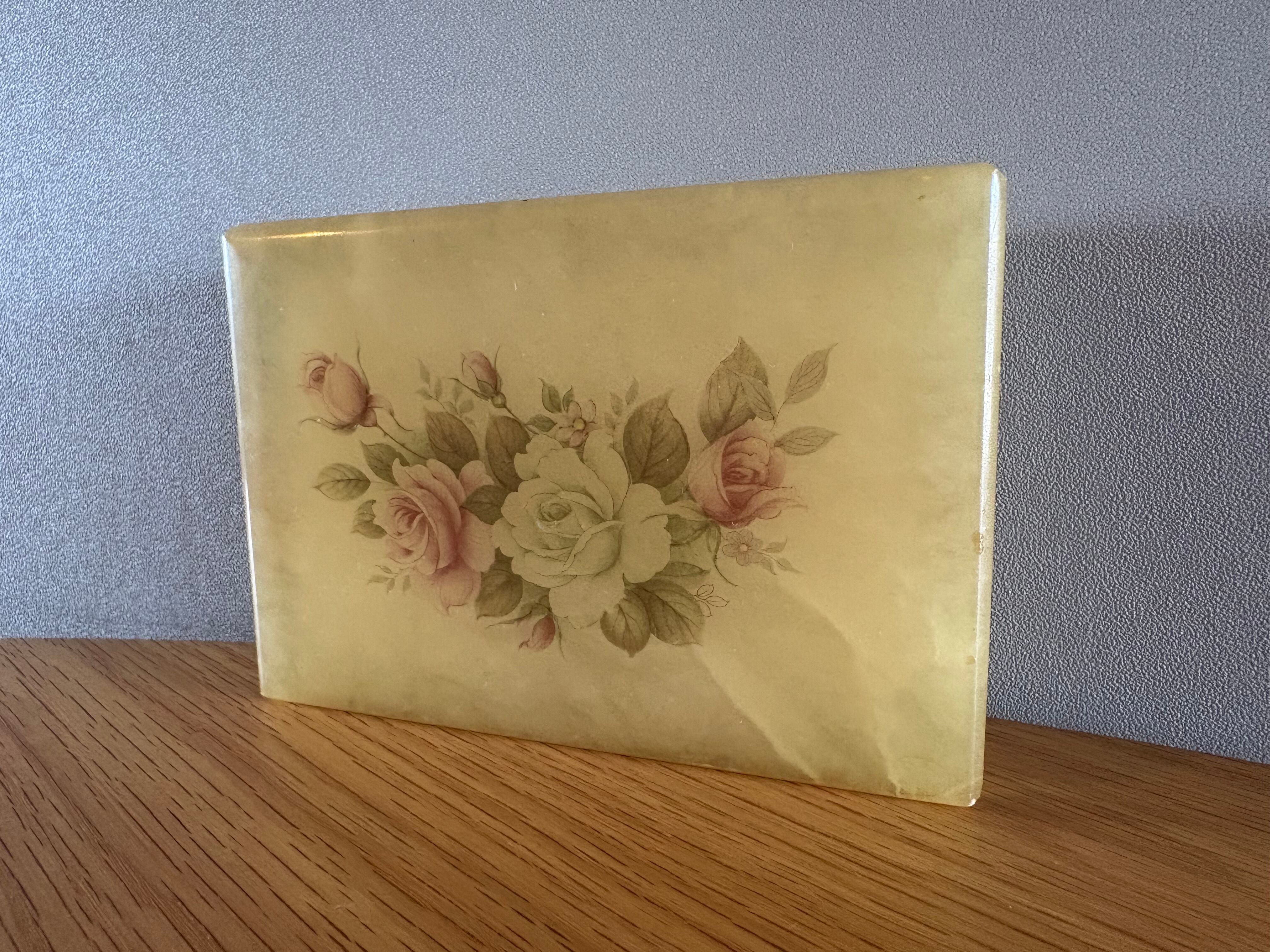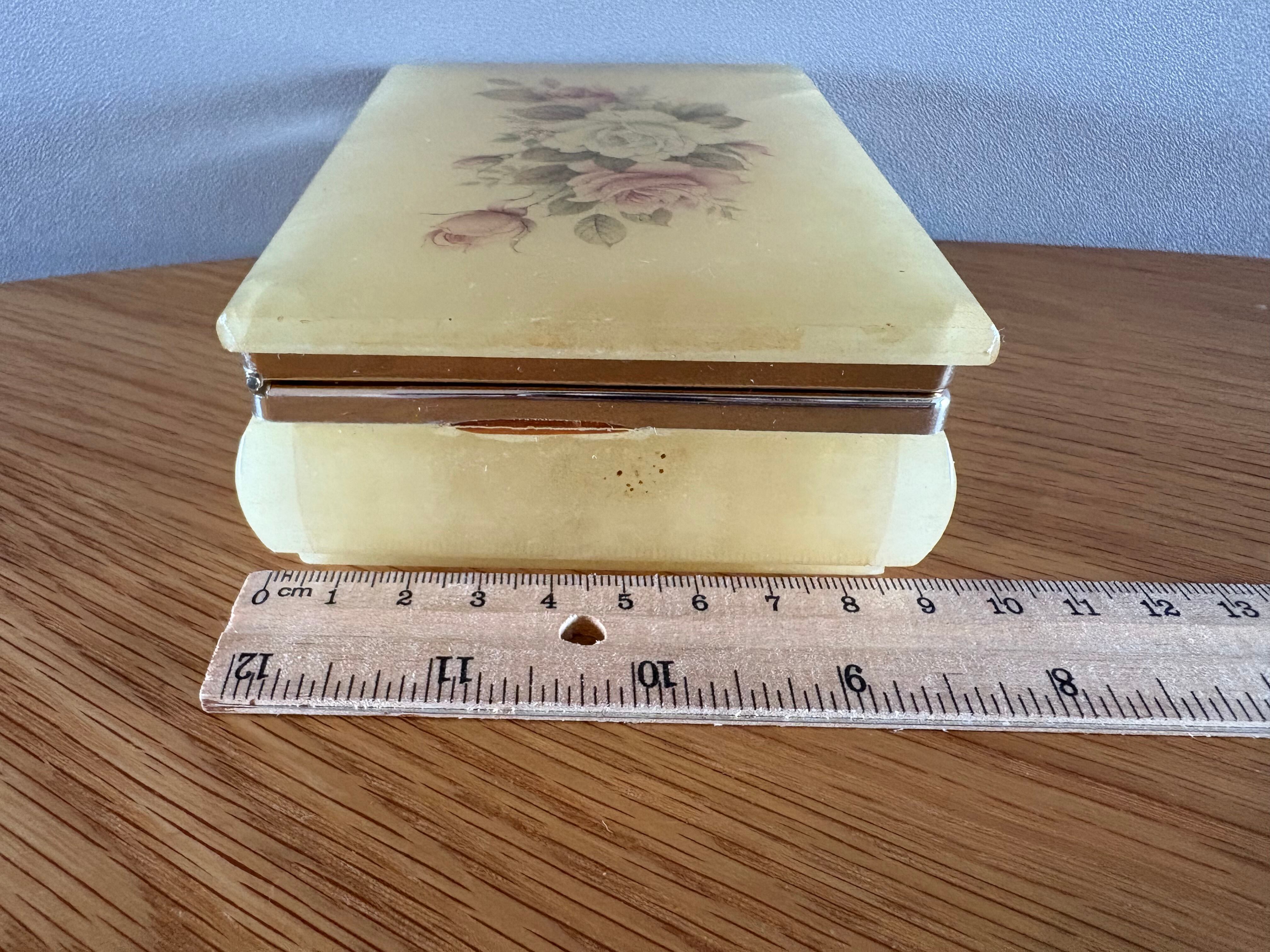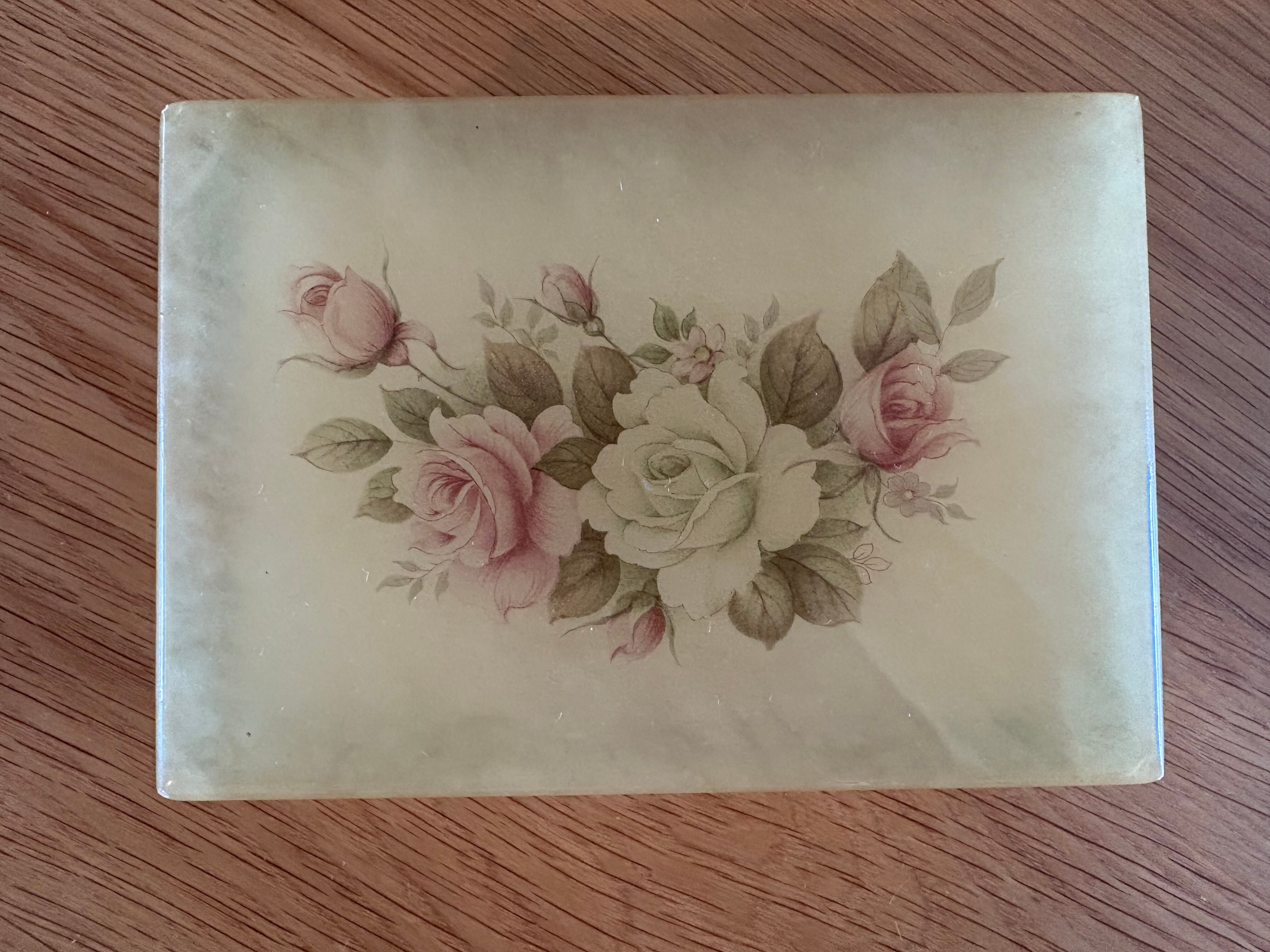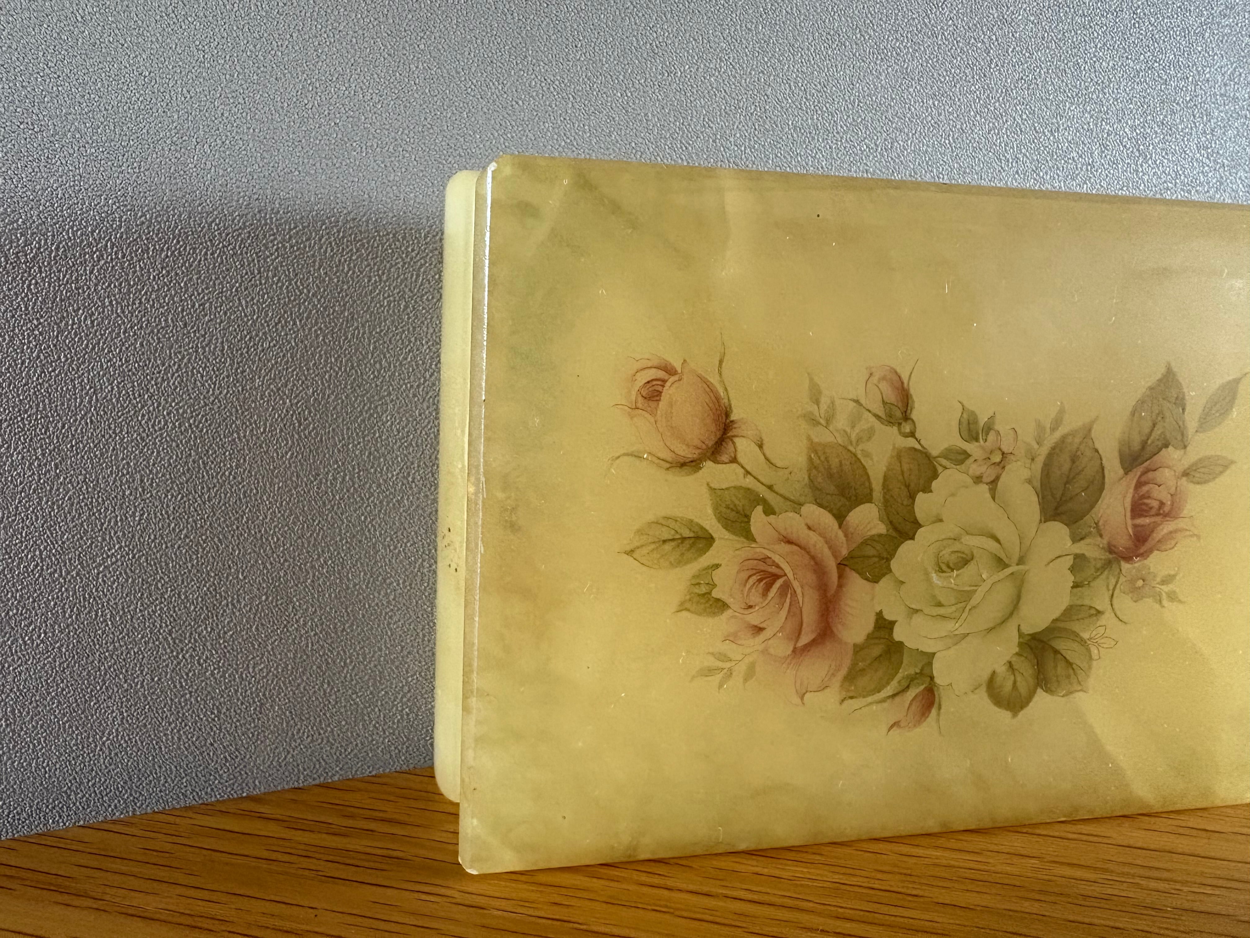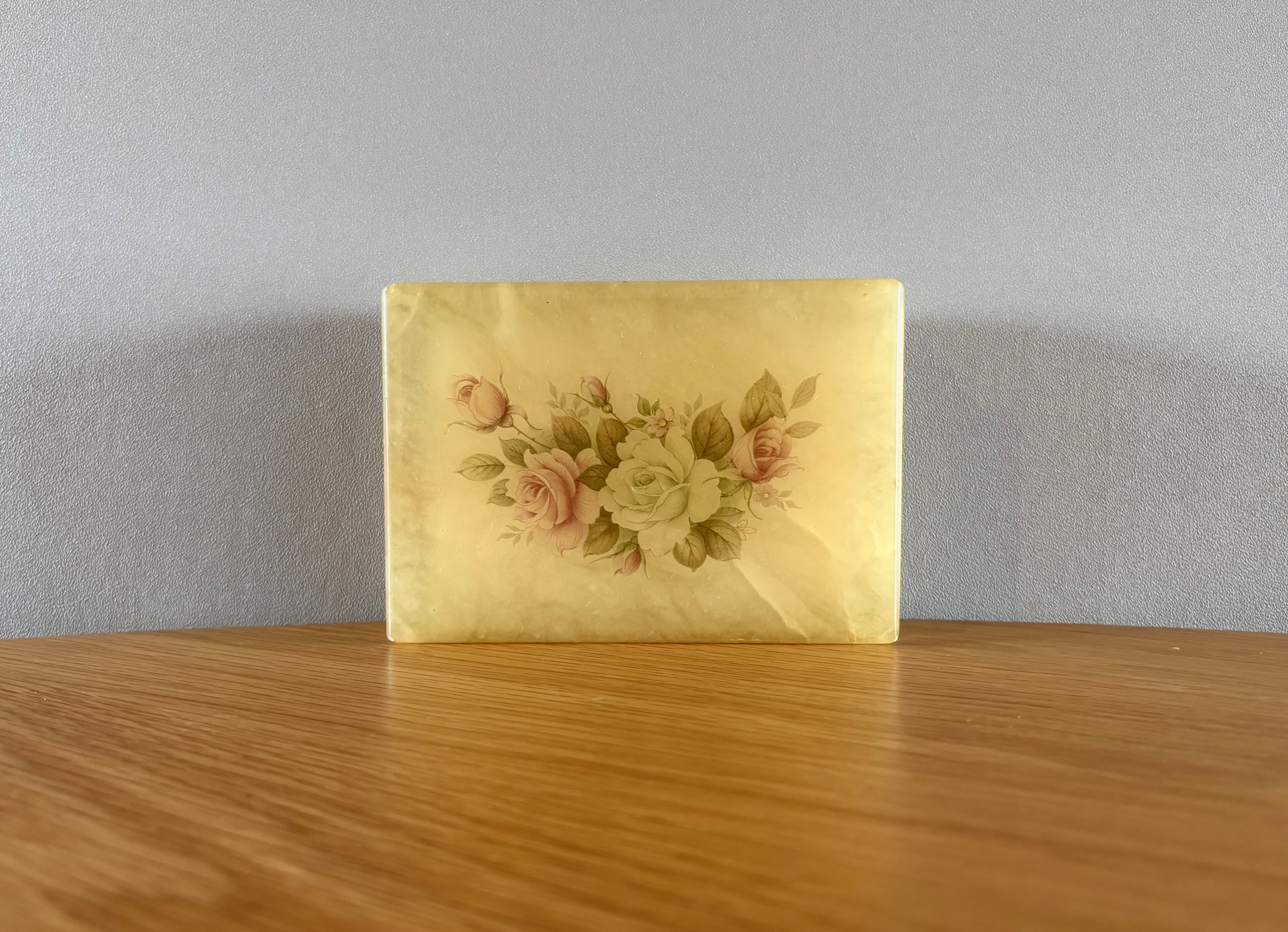 柔らかなクリームイエローの地に、エレガントなローズ柄が描かれた、クラシカルなアクセサリーケース。長い年月を経て、どこか儚げな風合いを纏ったその姿は、アンティークならではの深い味わいを感じさせます。