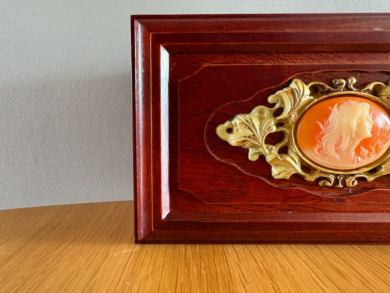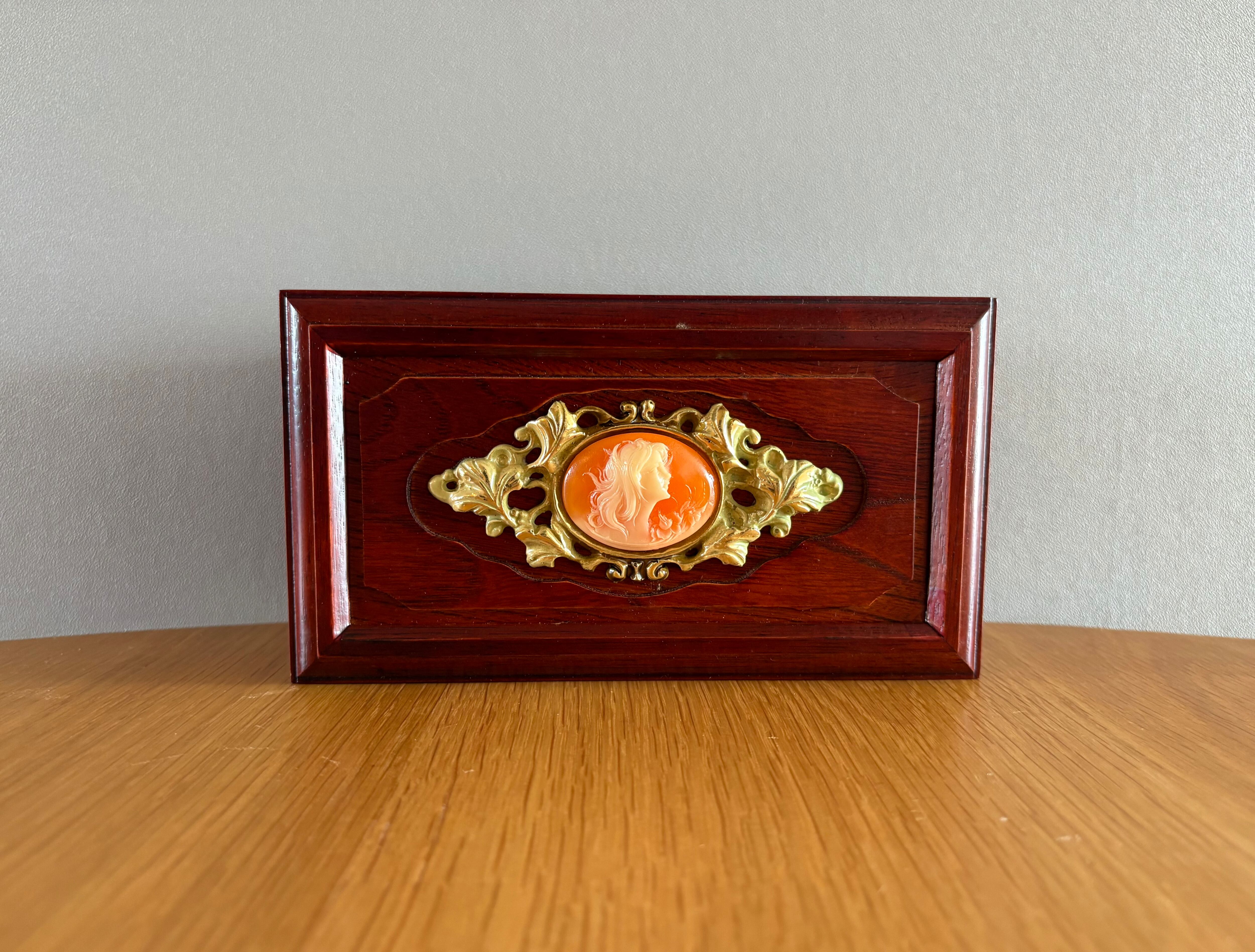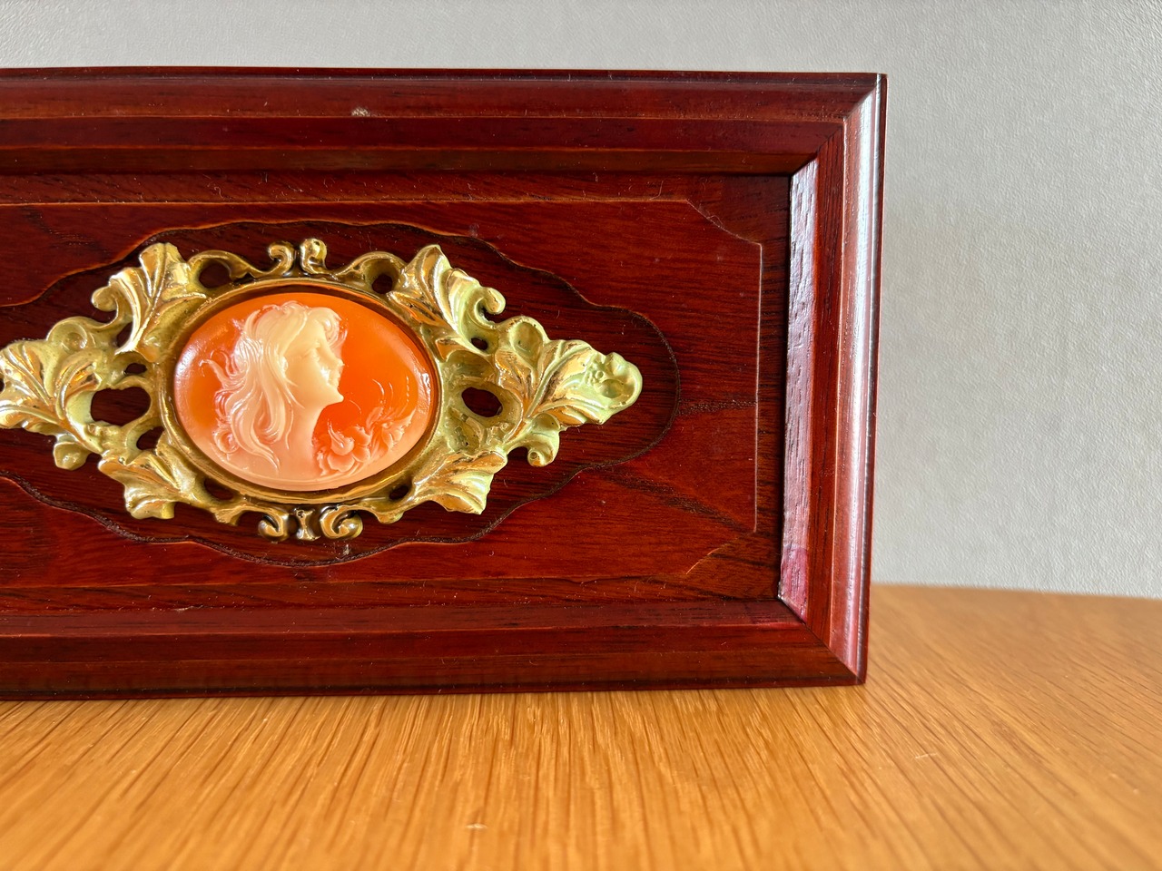 深みのある木目調のボディに、中央には優美なカメオ風装飾をあしらった、気品漂うアクセサリーケースです。