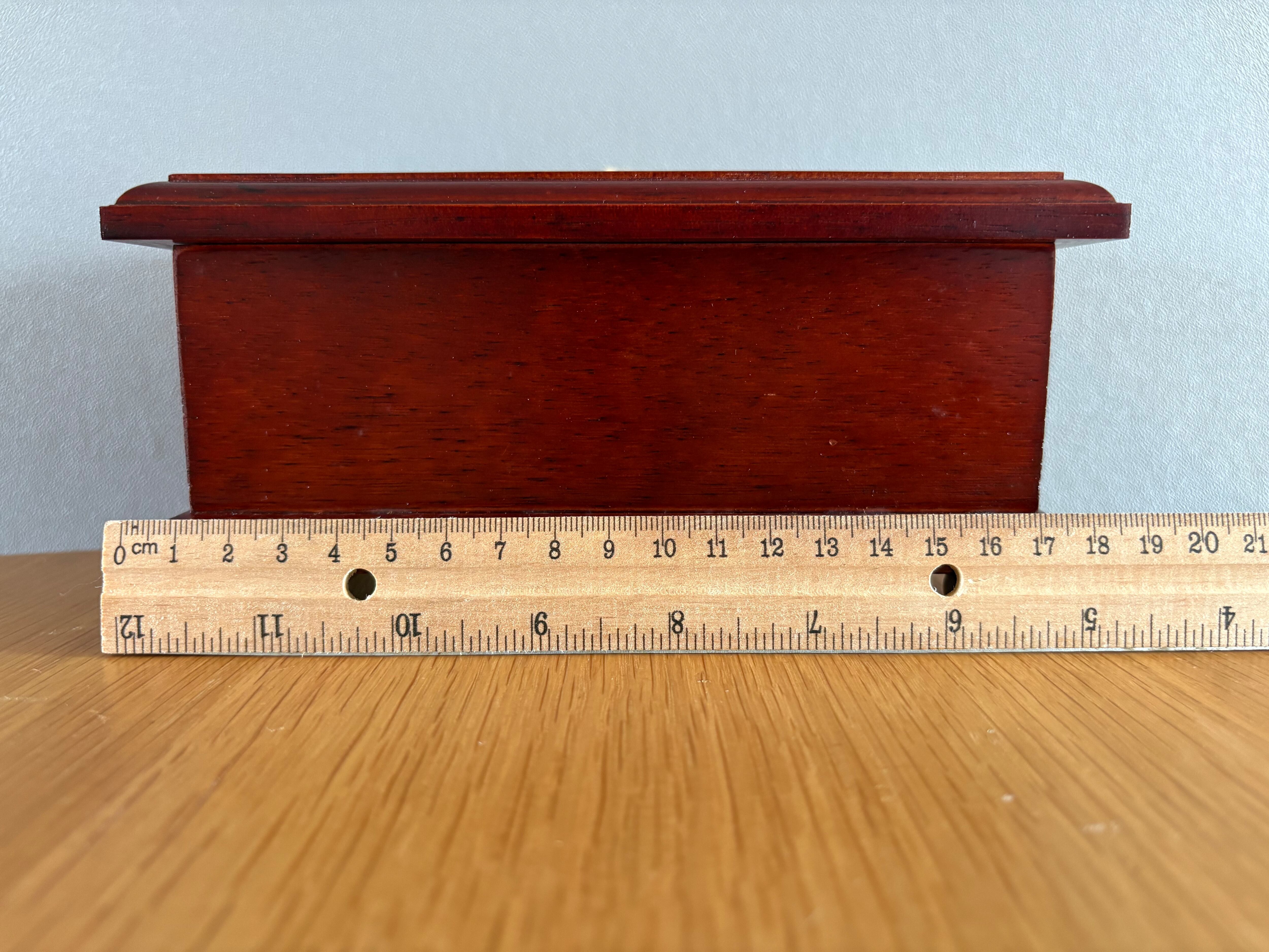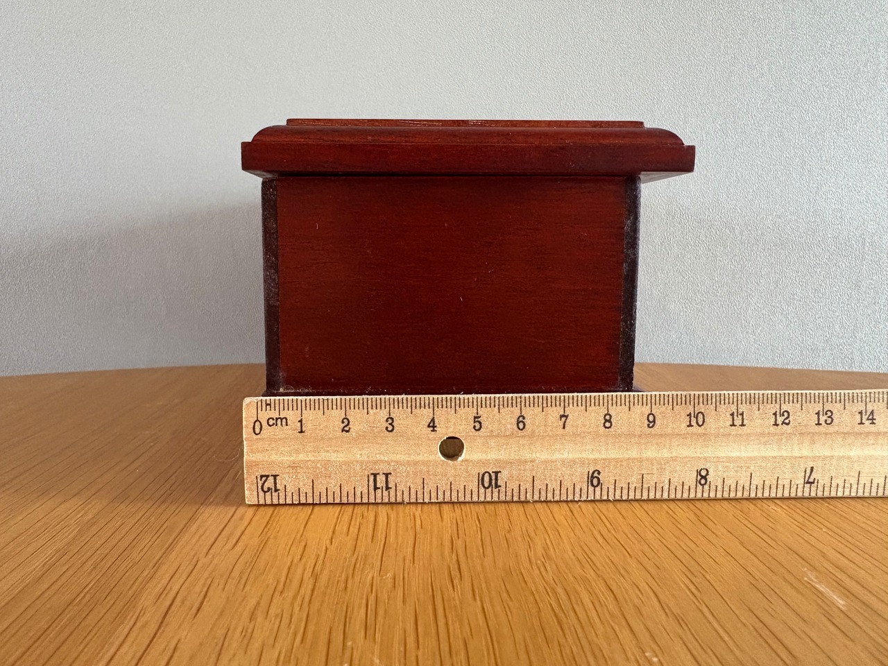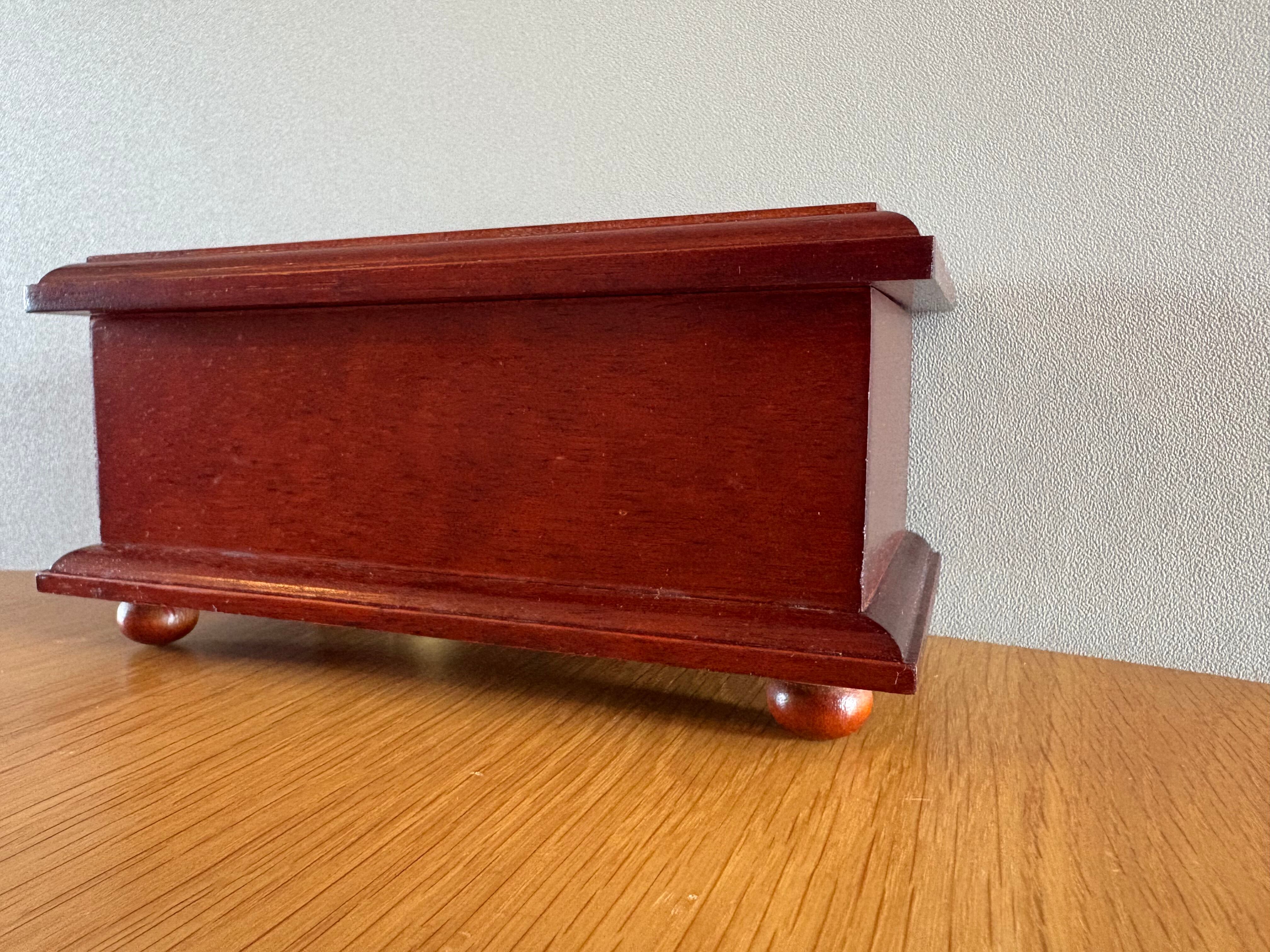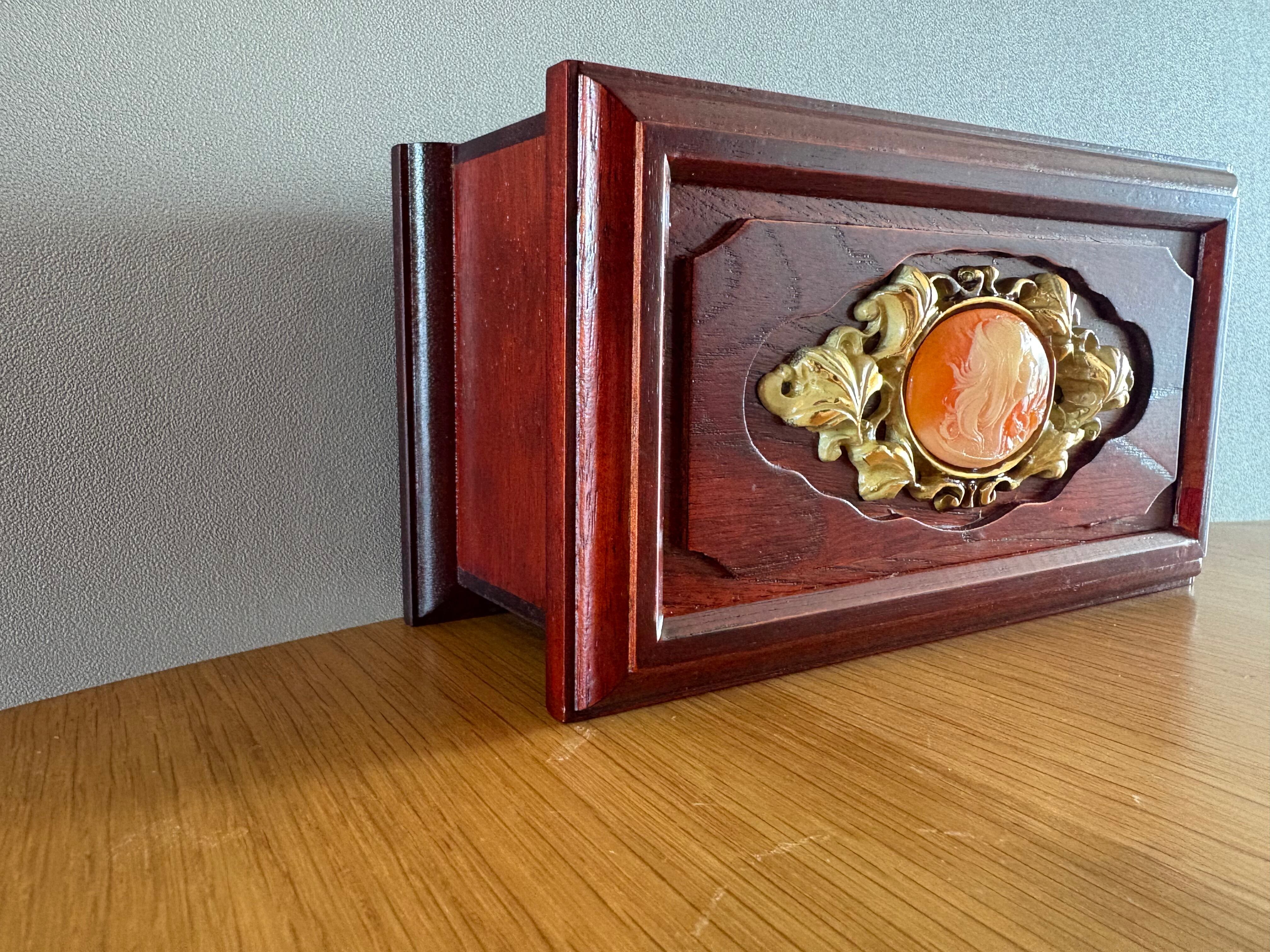 深みのある木目調のボディに、中央には優美なカメオ風装飾をあしらった、気品漂うアクセサリーケースです。