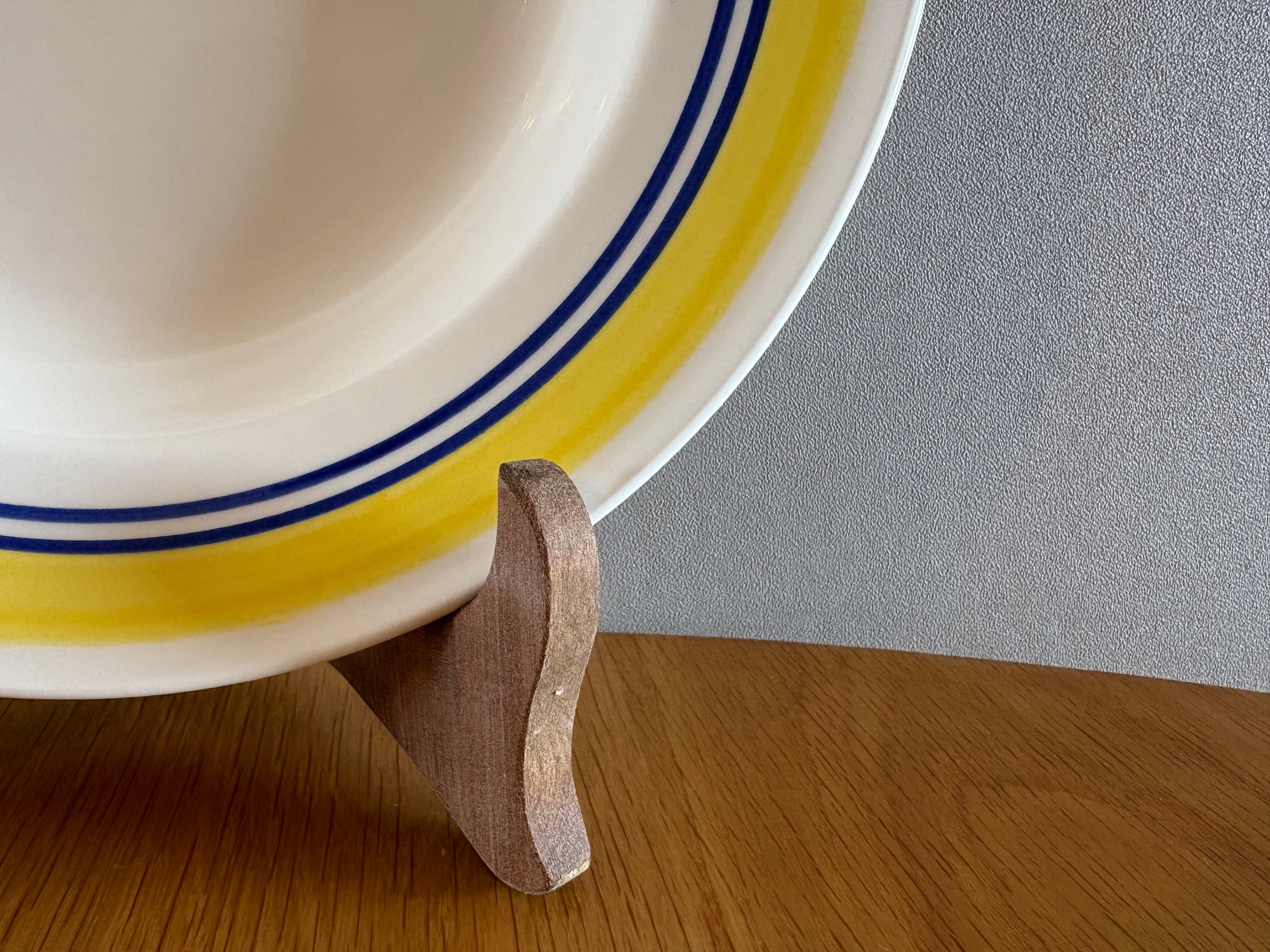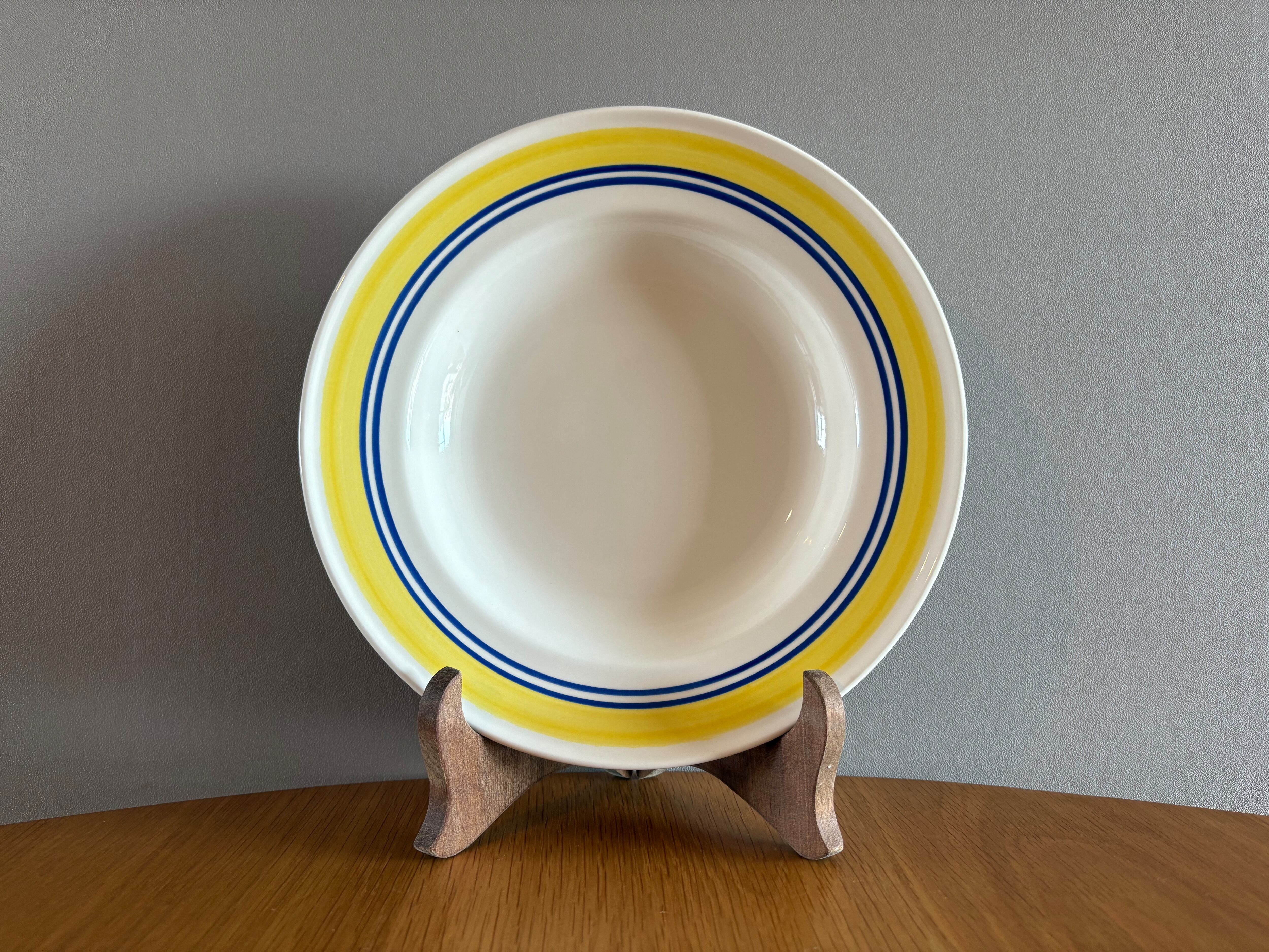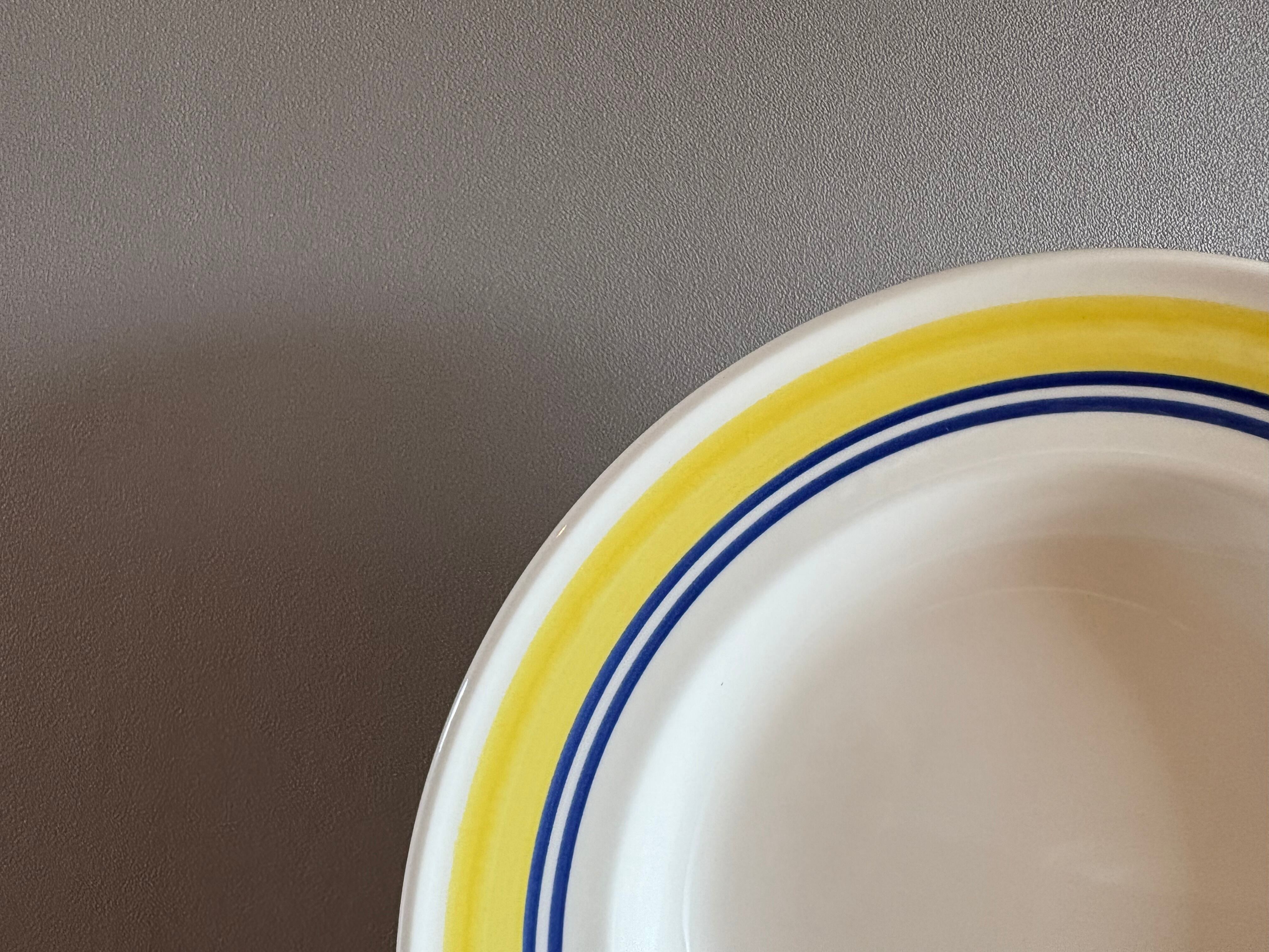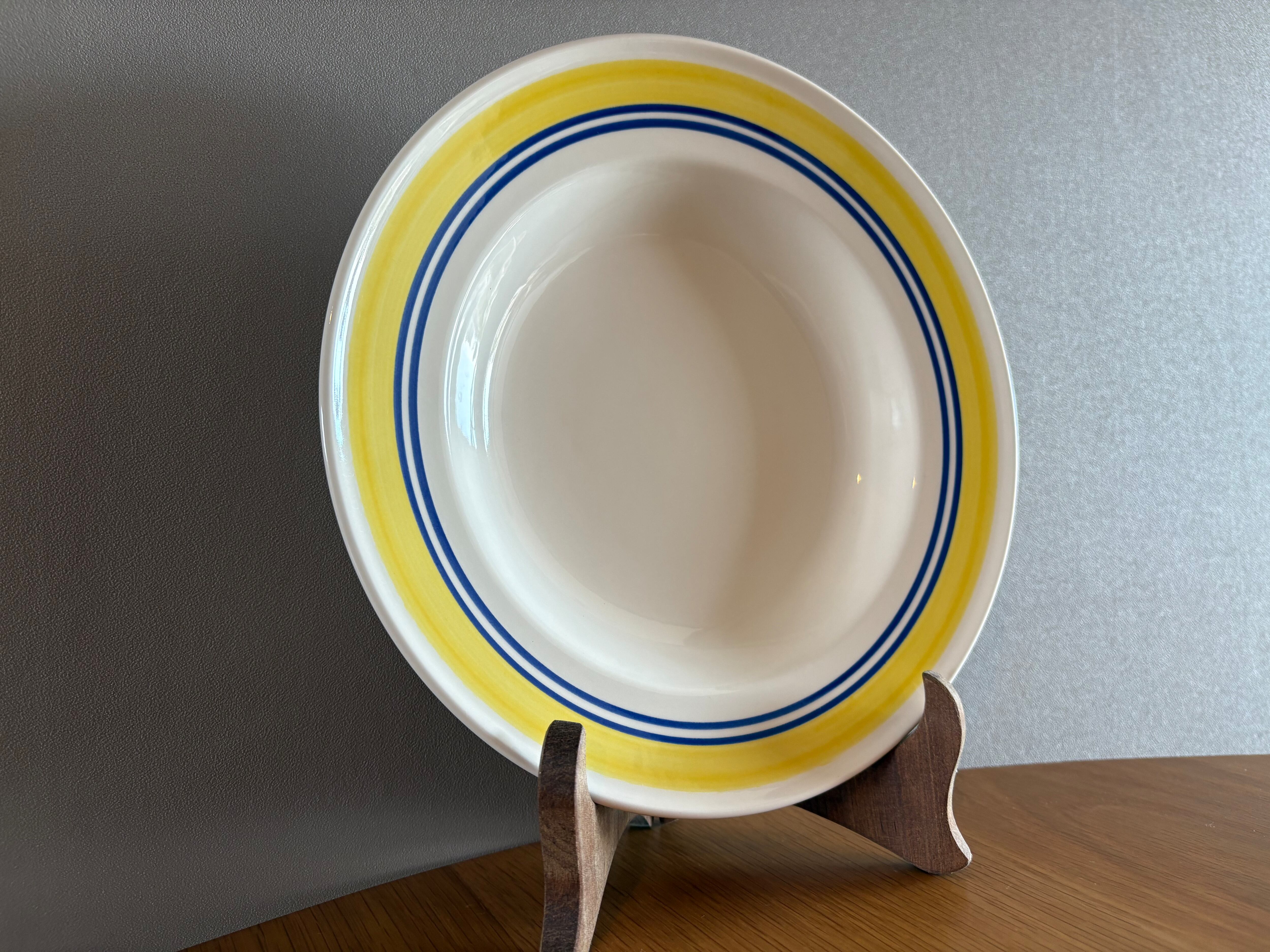 黄色と青のラインがアクセントになったポップで爽やかなデザインは、料理を引き立てるだけでなく、テーブルコーディネートのポイントにも。