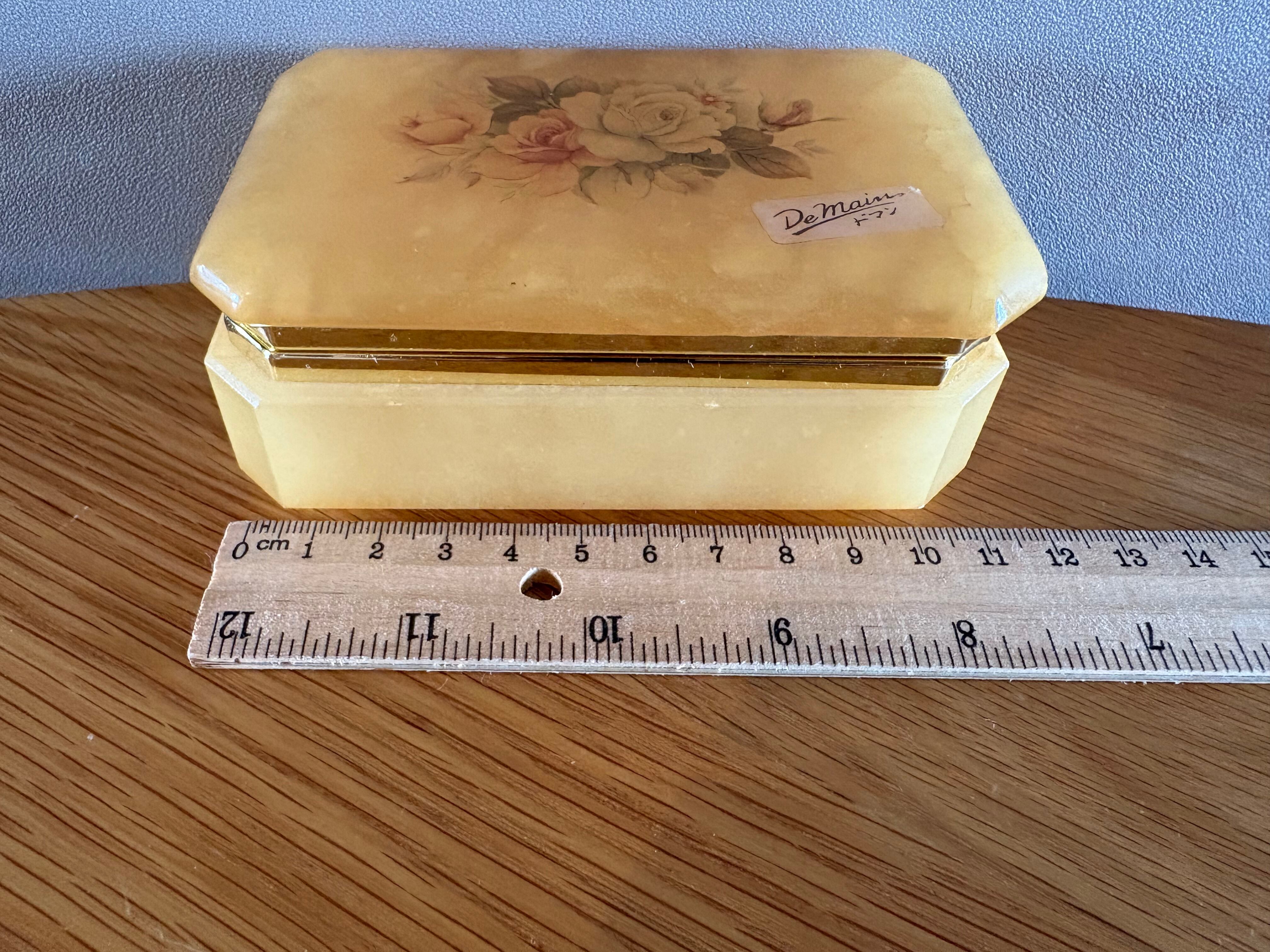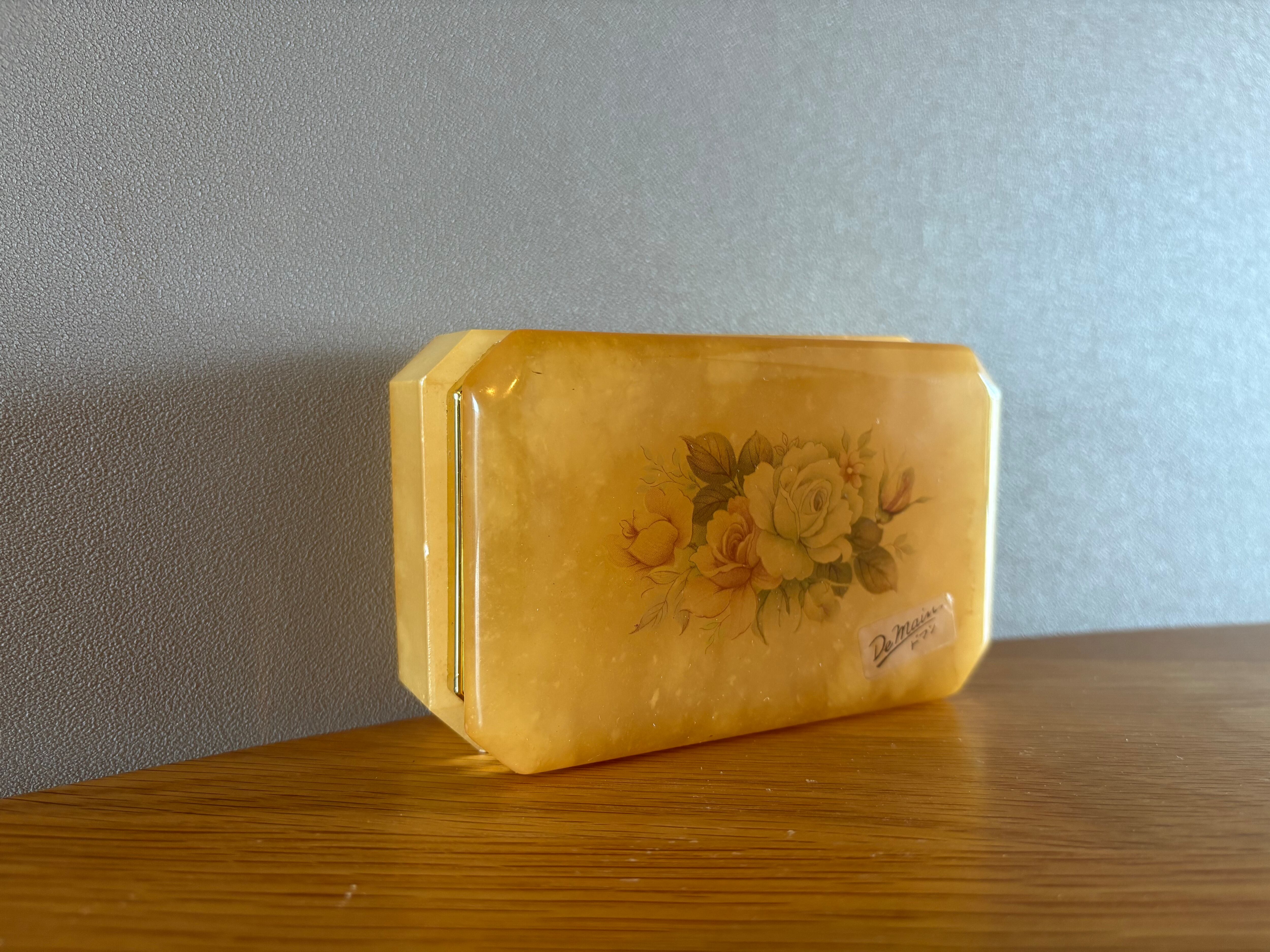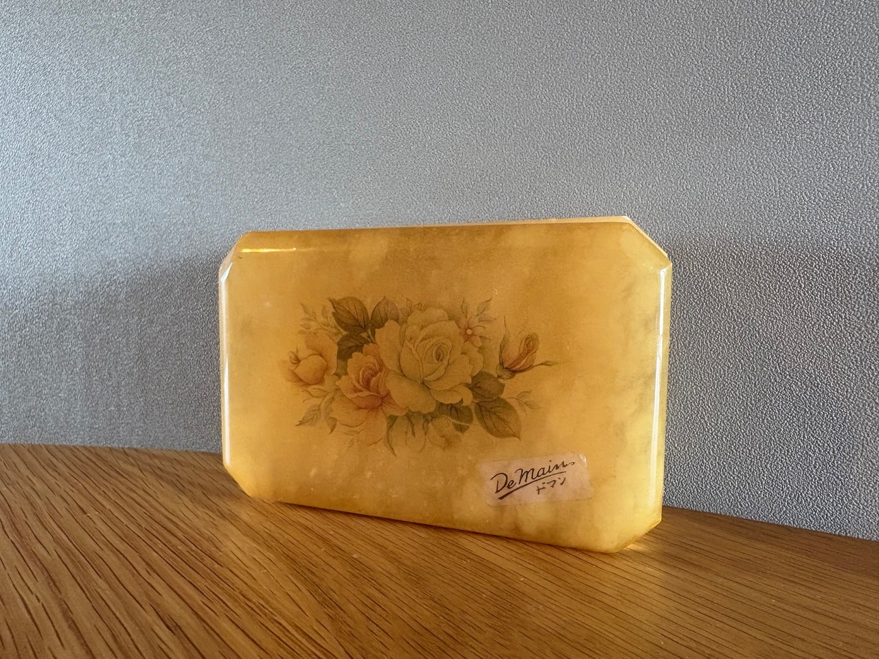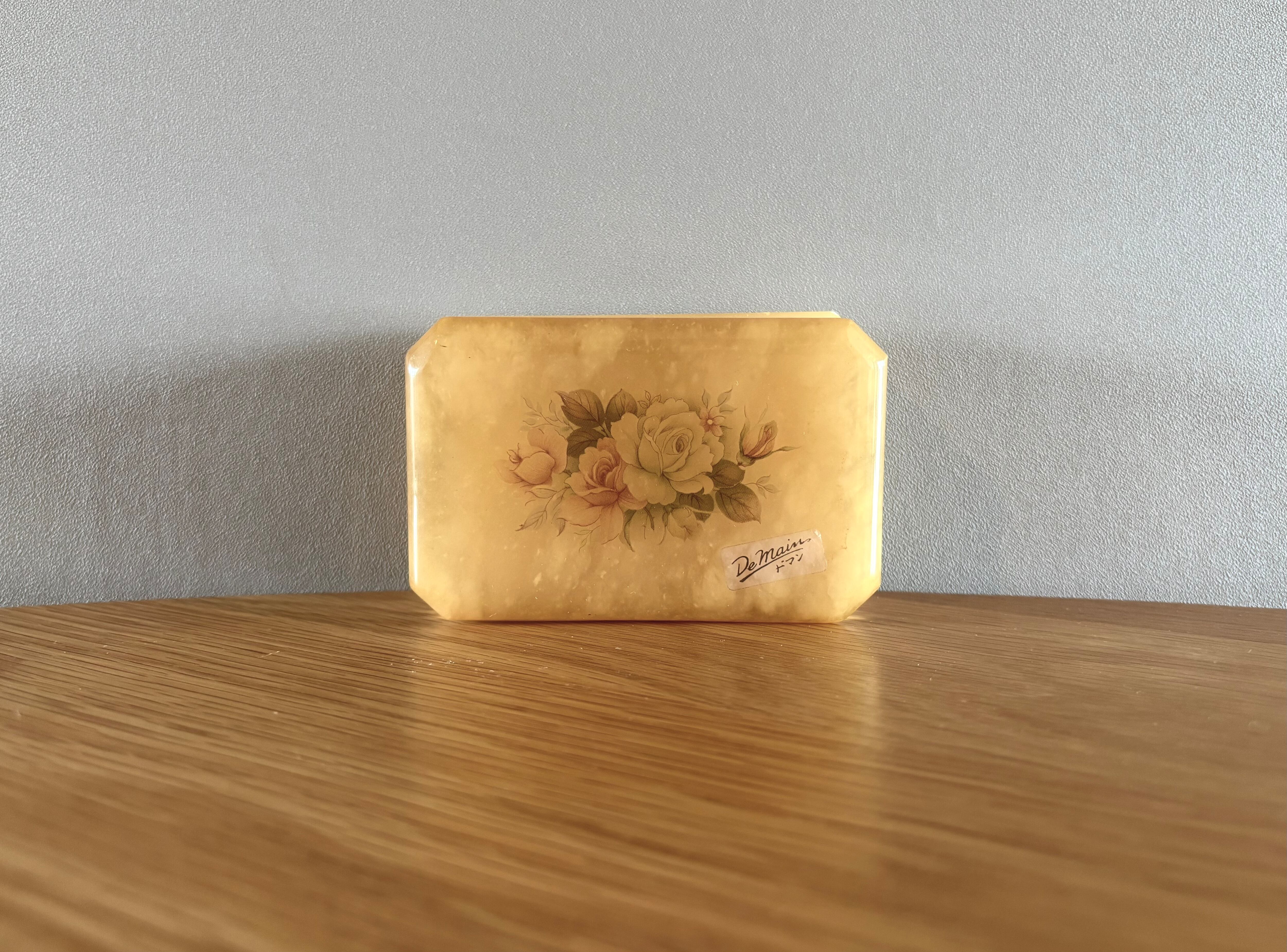 柔らかなクリームイエローの地に、エレガントなローズ柄が描かれた、クラシカルなアクセサリーケース。長い年月を経て、どこか儚げな風合いを纏ったその姿は、アンティークならではの深い味わいを感じさせます。