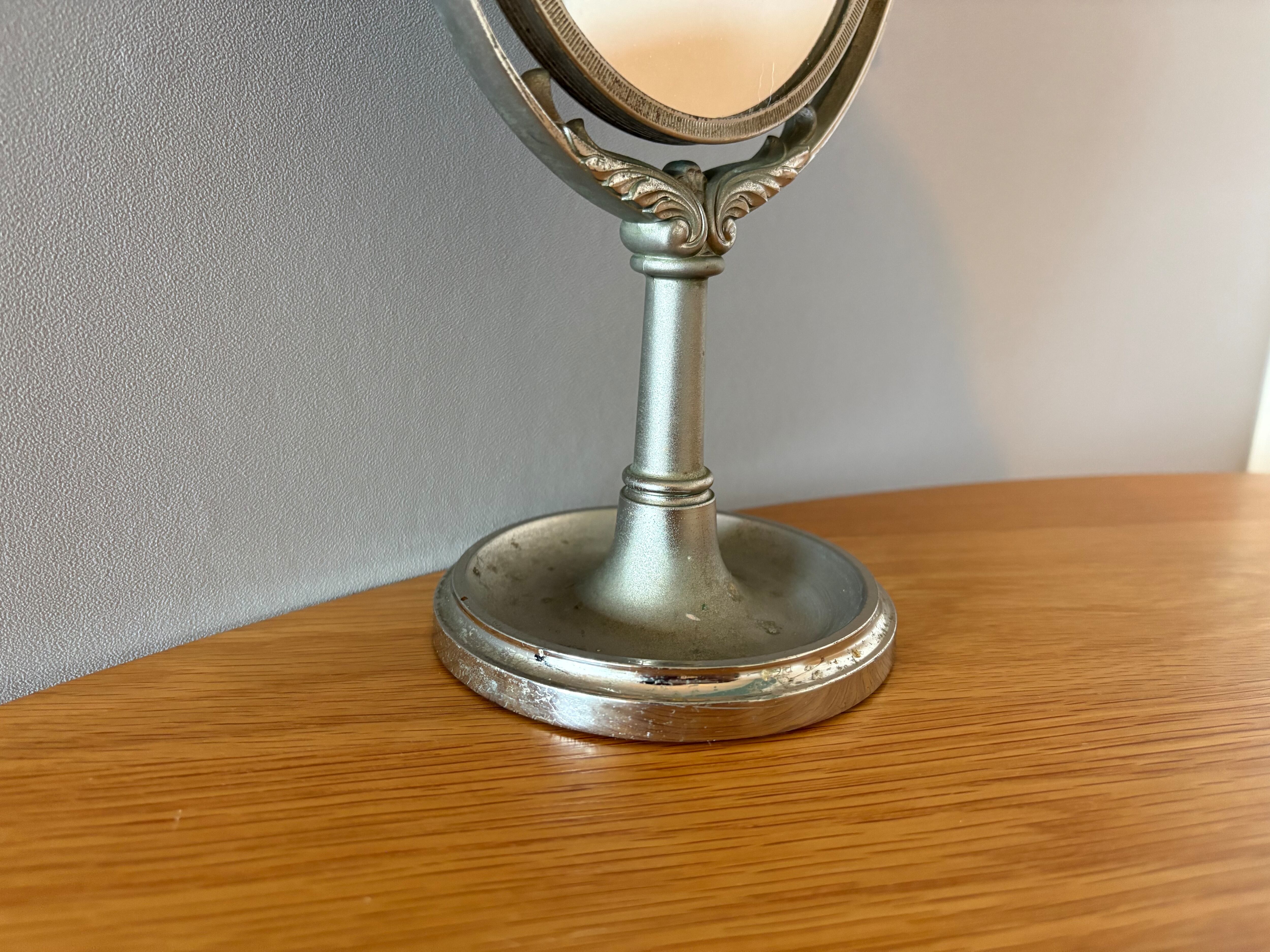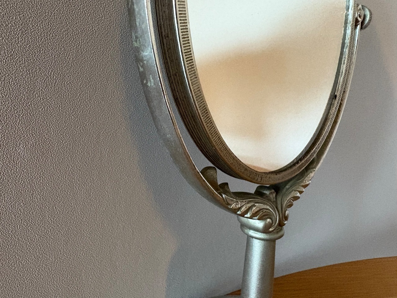鏡の裏側の生地が良い感じにレトロさを増していて美しくなっております。台座もしっかりしてます。鏡の面はややくすみがありやや見えにくいので、鏡として使うよりも、主に部屋をアンティークに彩る置物、ディスプレイとして使っておりました。