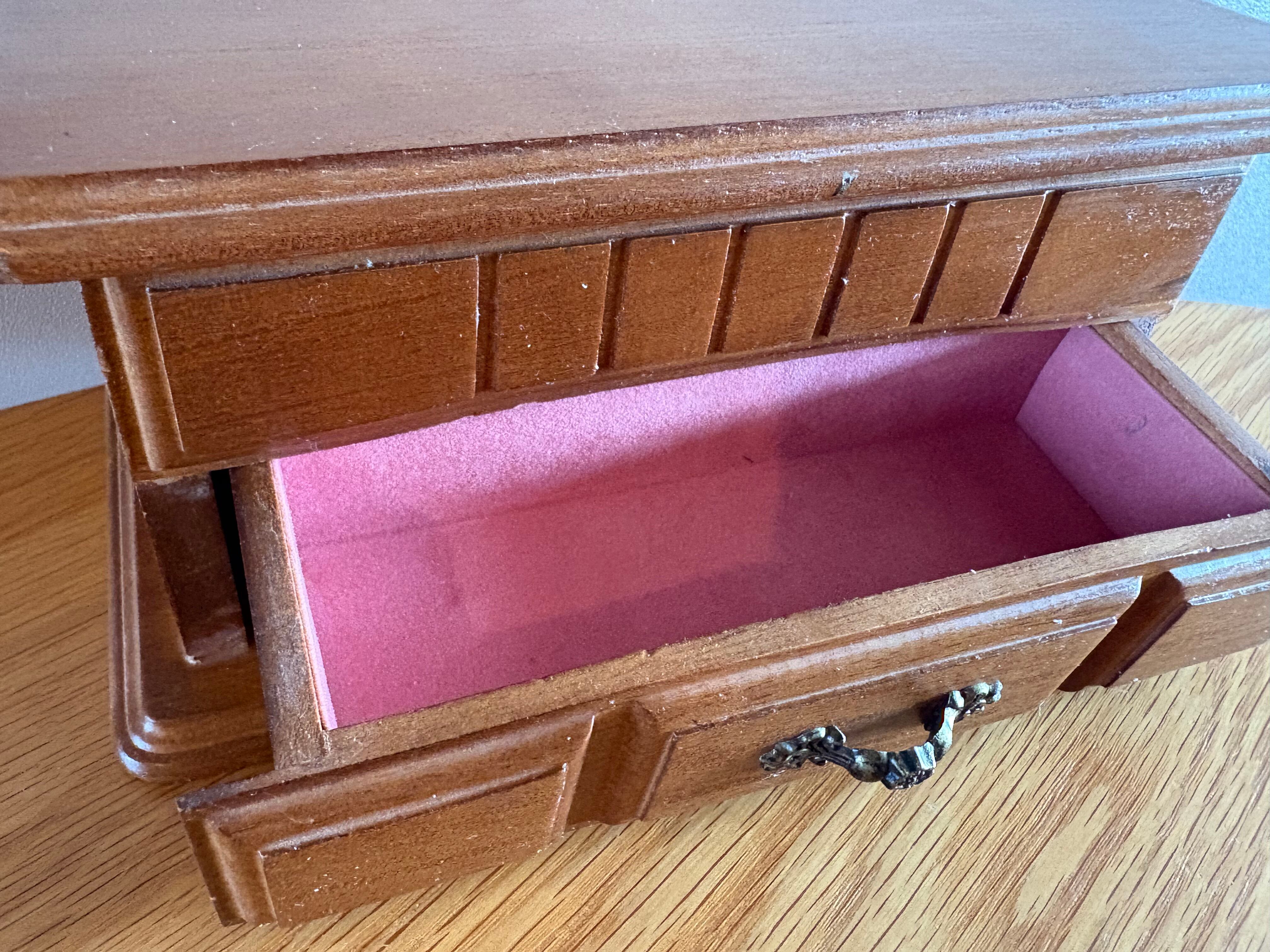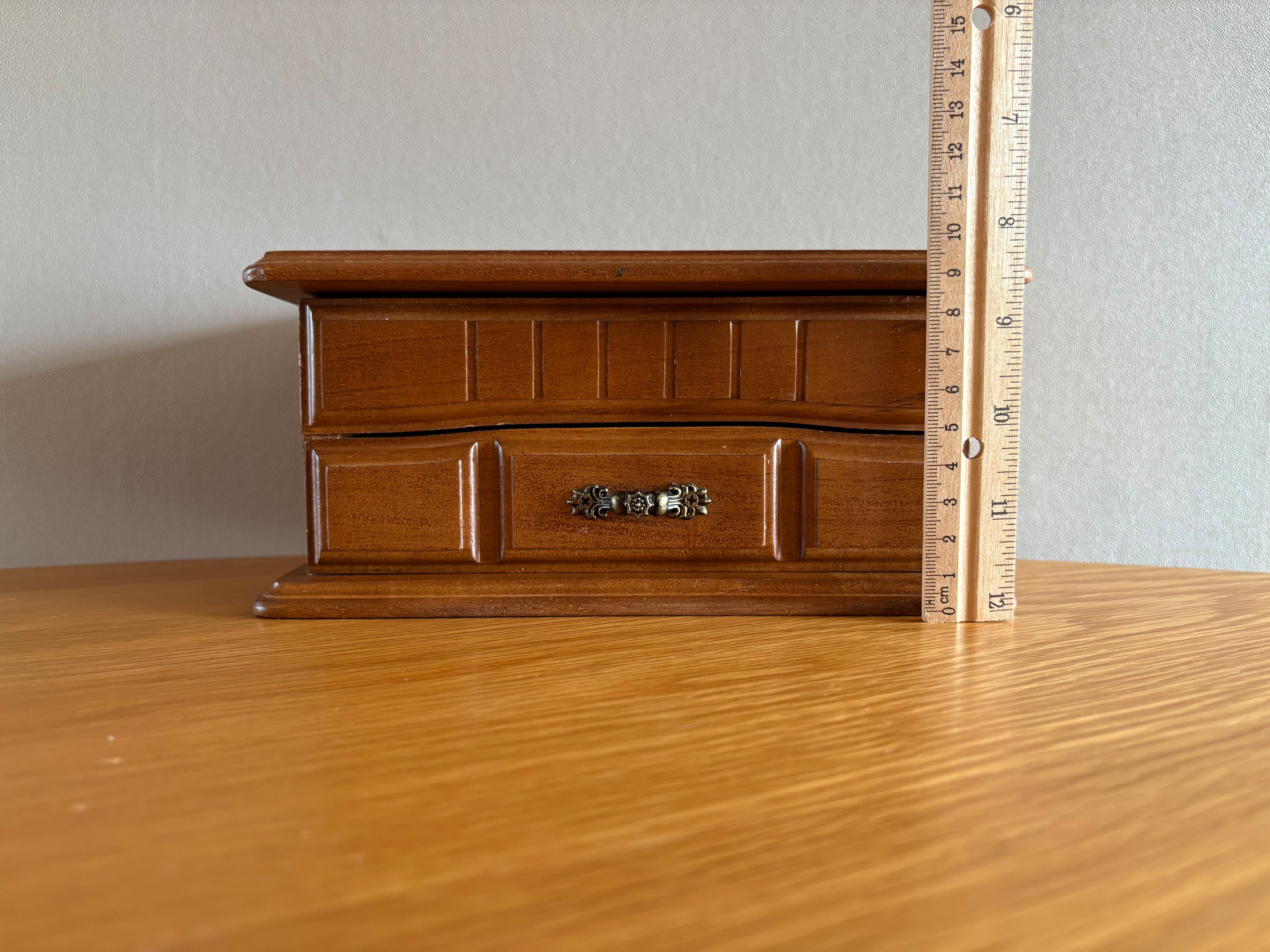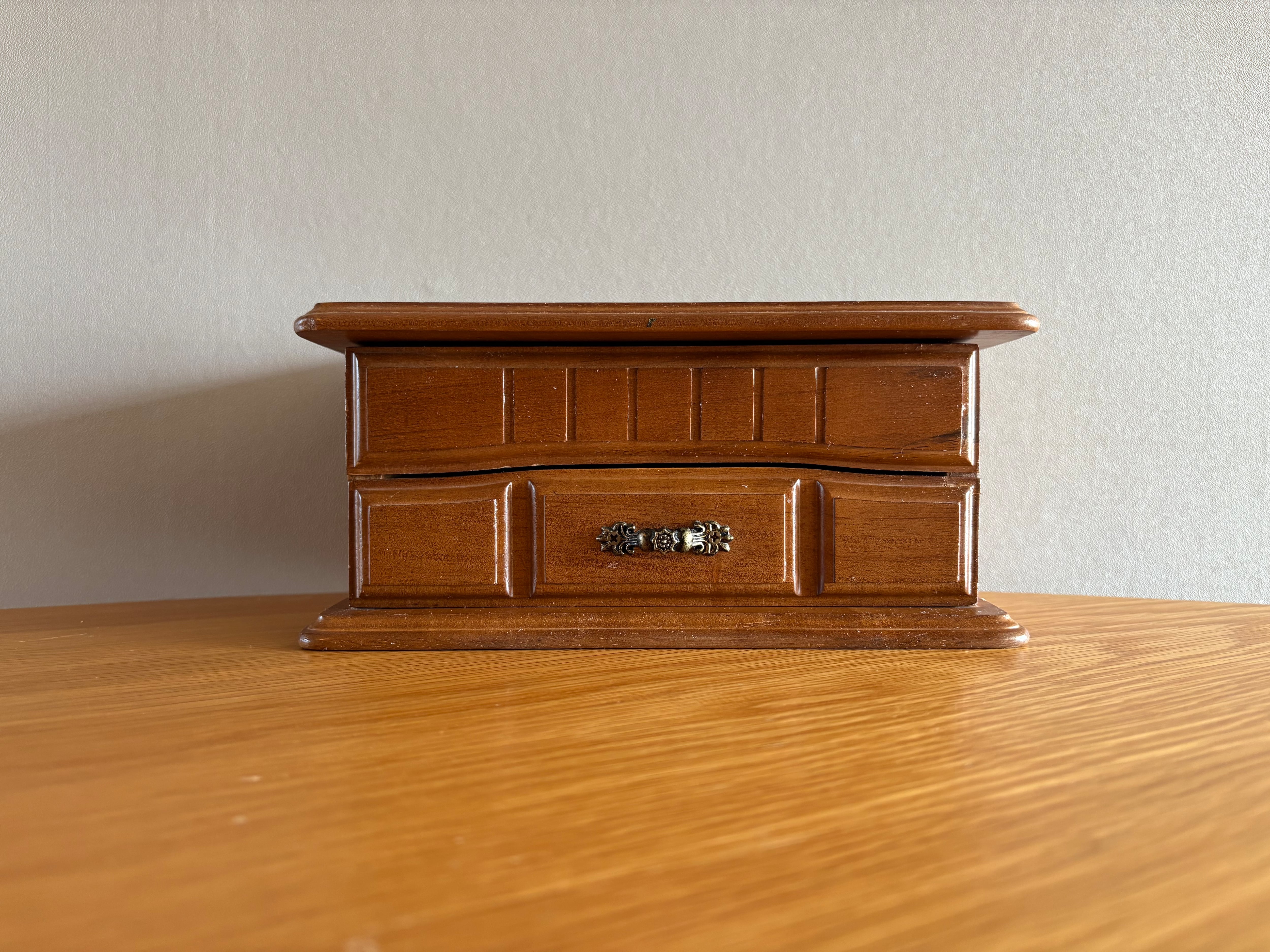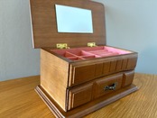 温もりのある木目調のボディの気品漂うアクセサリーケースです。引き出しを開けると、優しいメロディが流れ、まるでヨーロッパの古き良き時代にタイムスリップしたかのようなロマンチックなひとときを演出します。