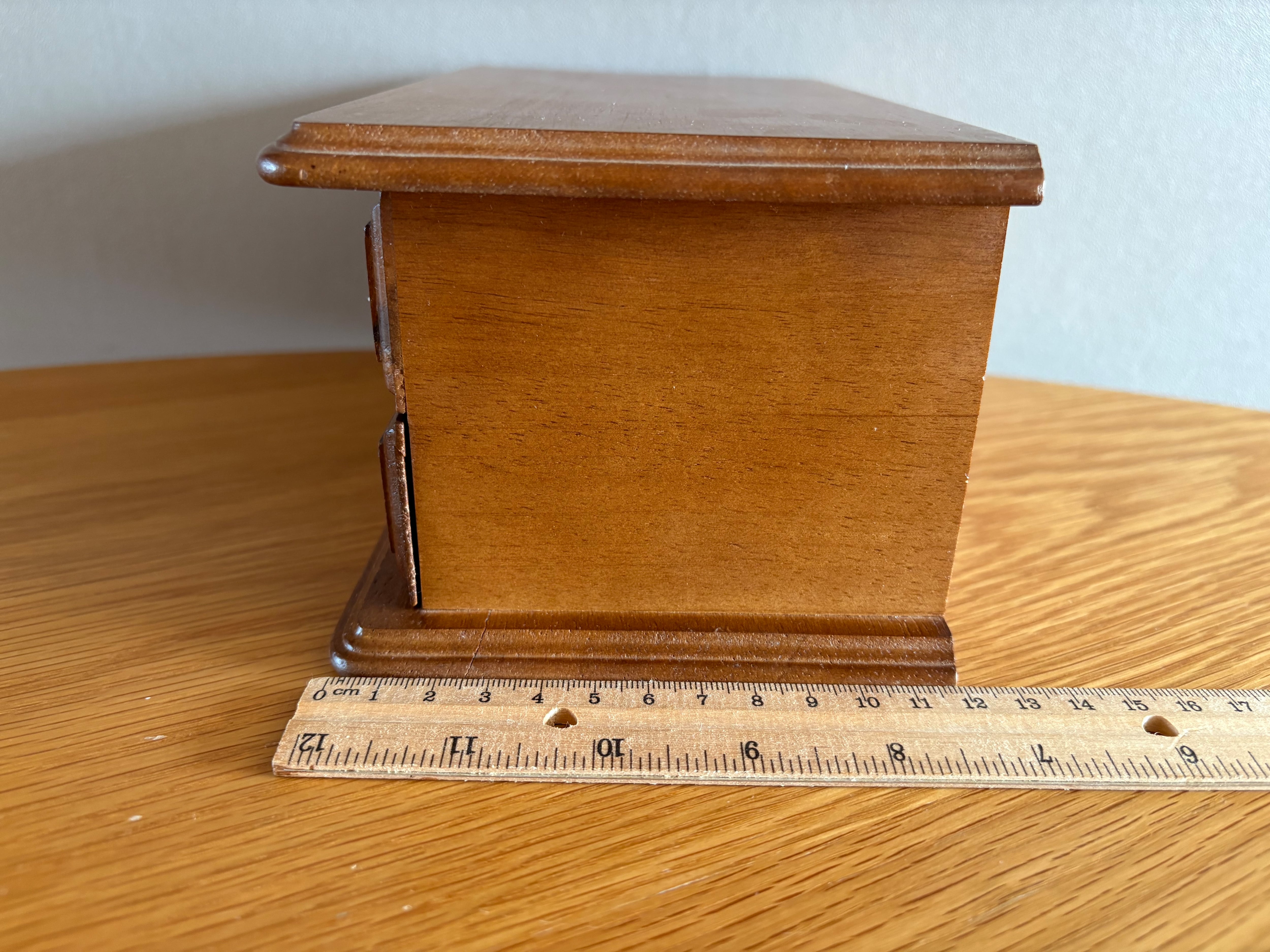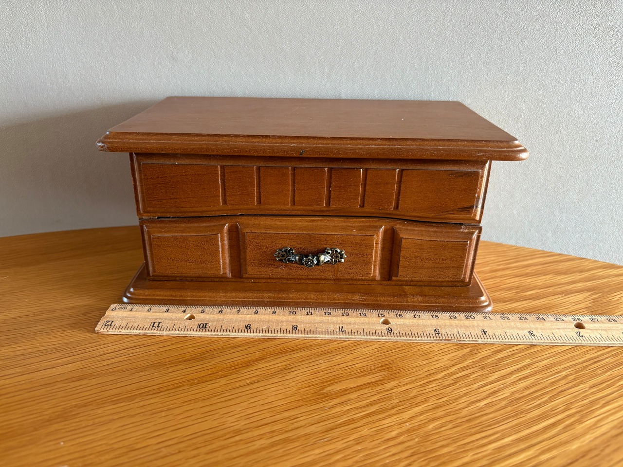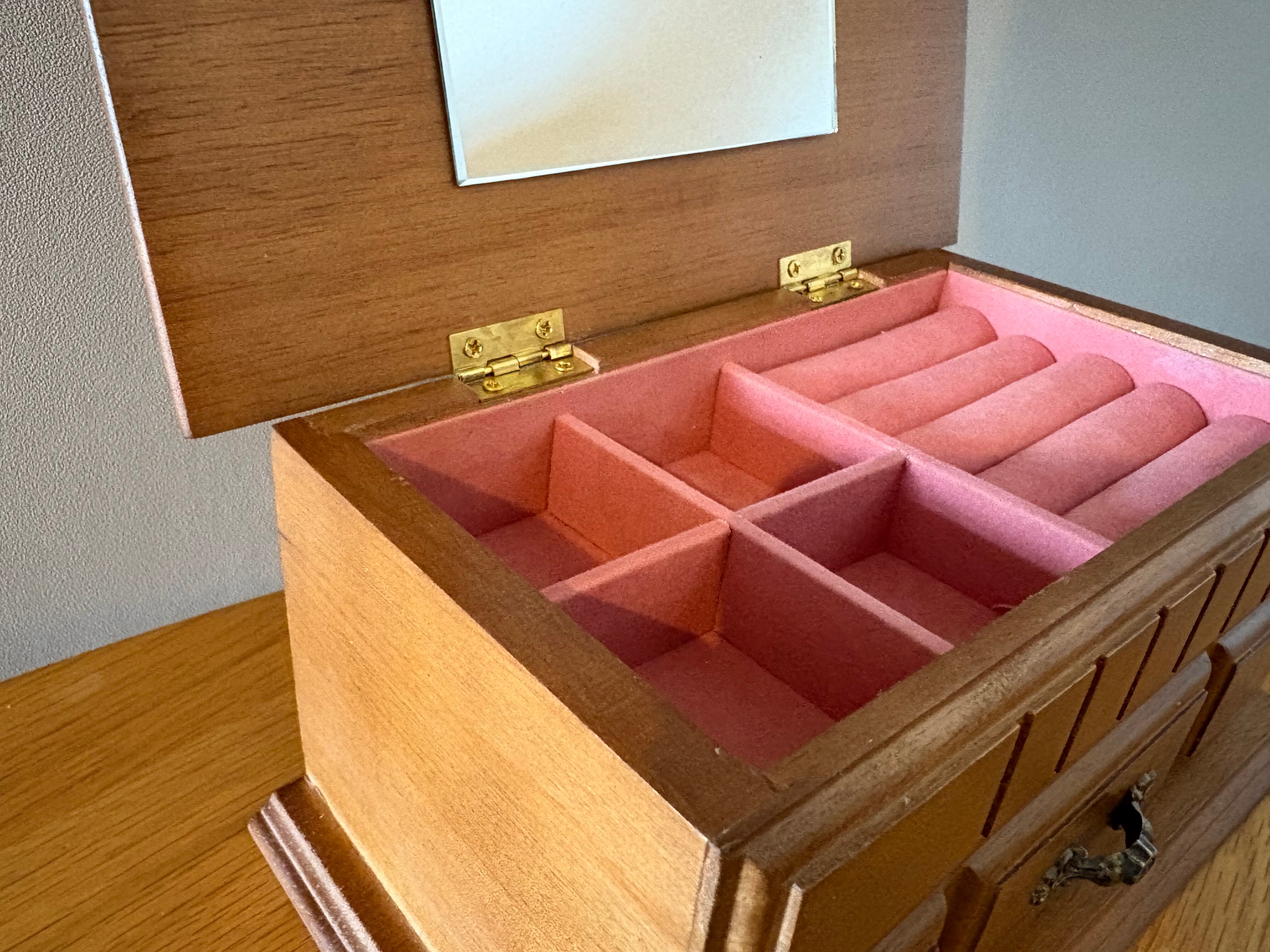 温もりのある木目調のボディの気品漂うアクセサリーケースです。引き出しを開けると、優しいメロディが流れ、まるでヨーロッパの古き良き時代にタイムスリップしたかのようなロマンチックなひとときを演出します。