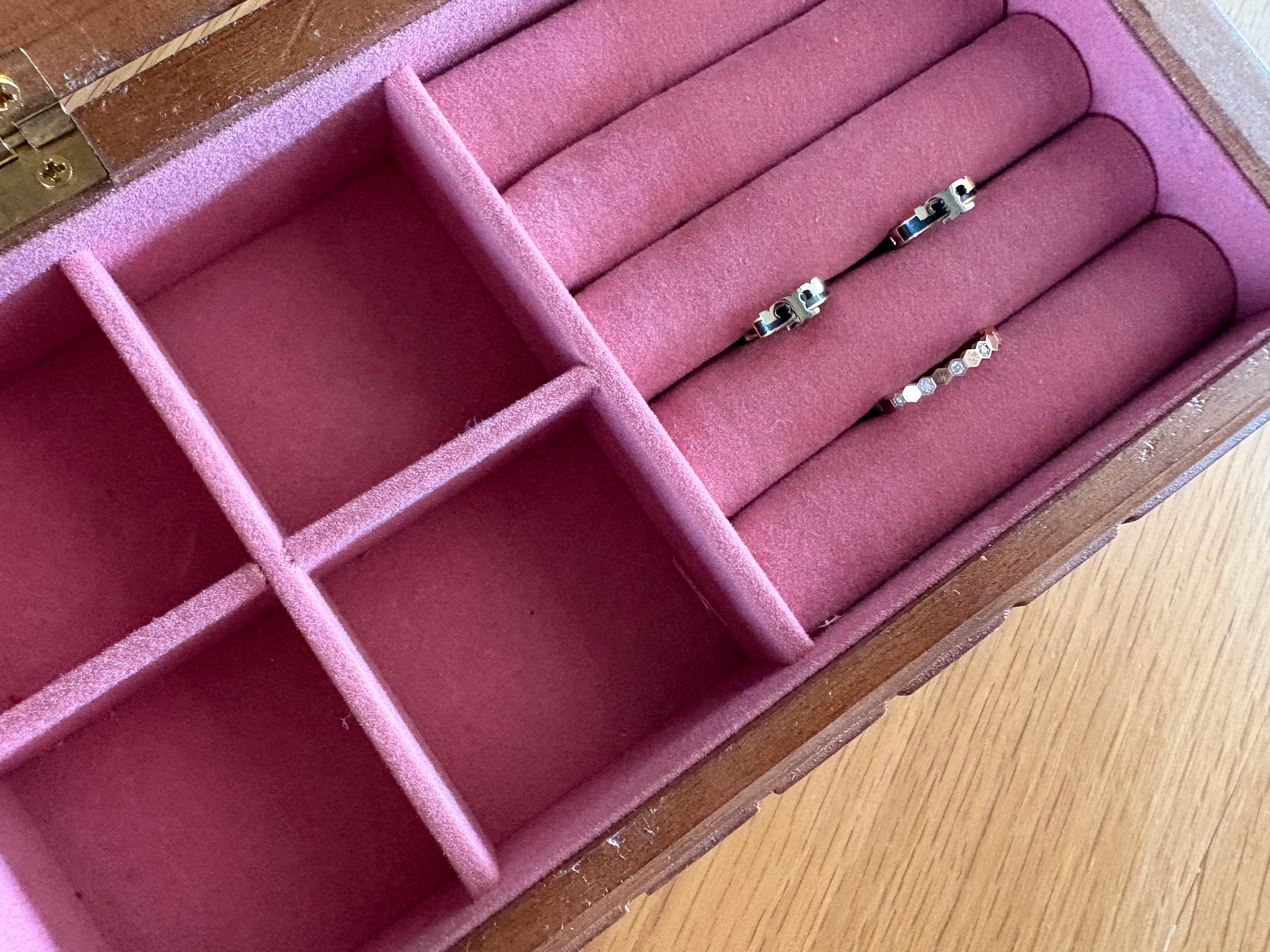 仕切り付きでリングやブレスレット、ピアスなどをきれいに収納可能。実用性と美しさを兼ね備えた逸品です。
