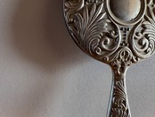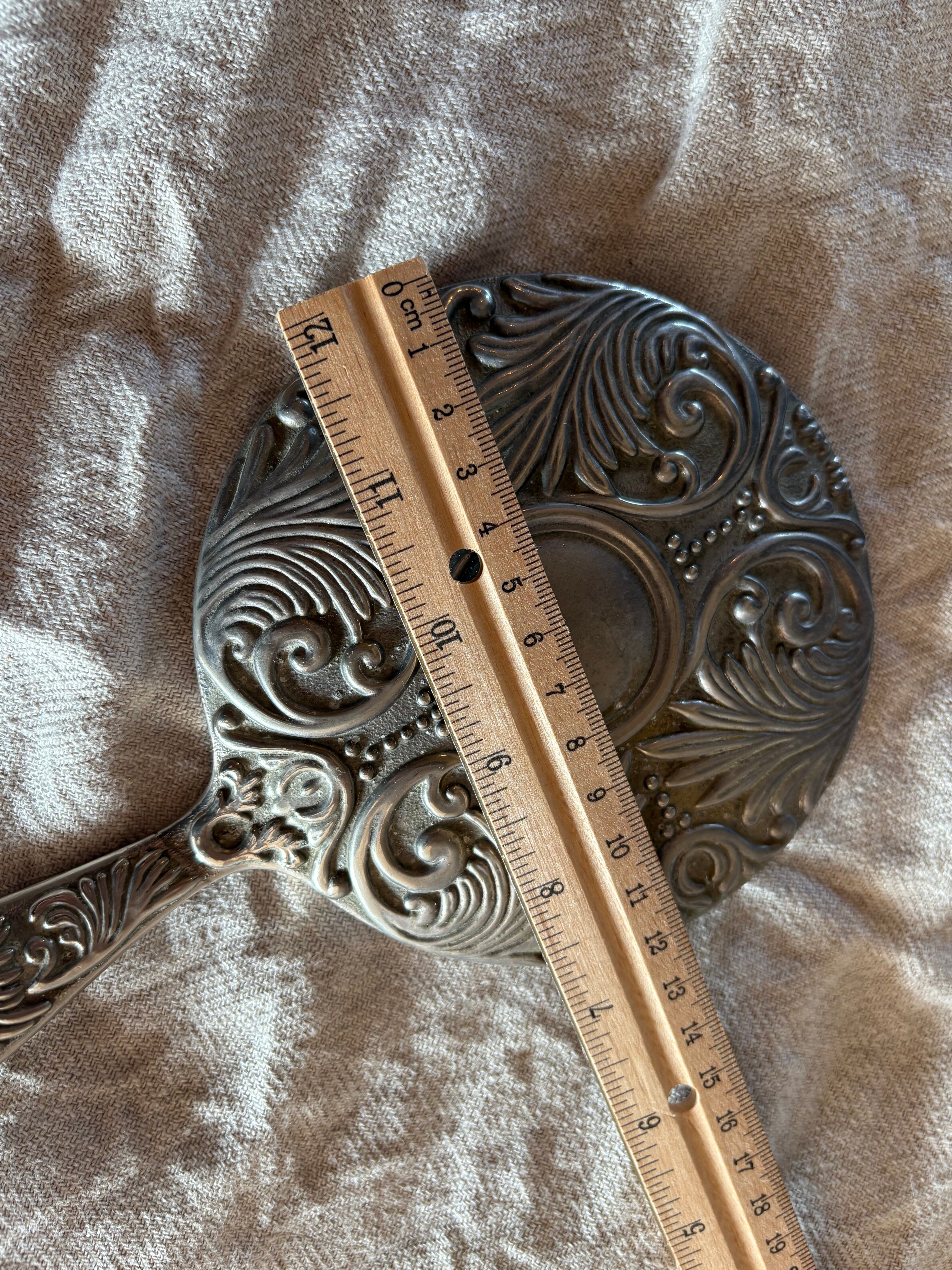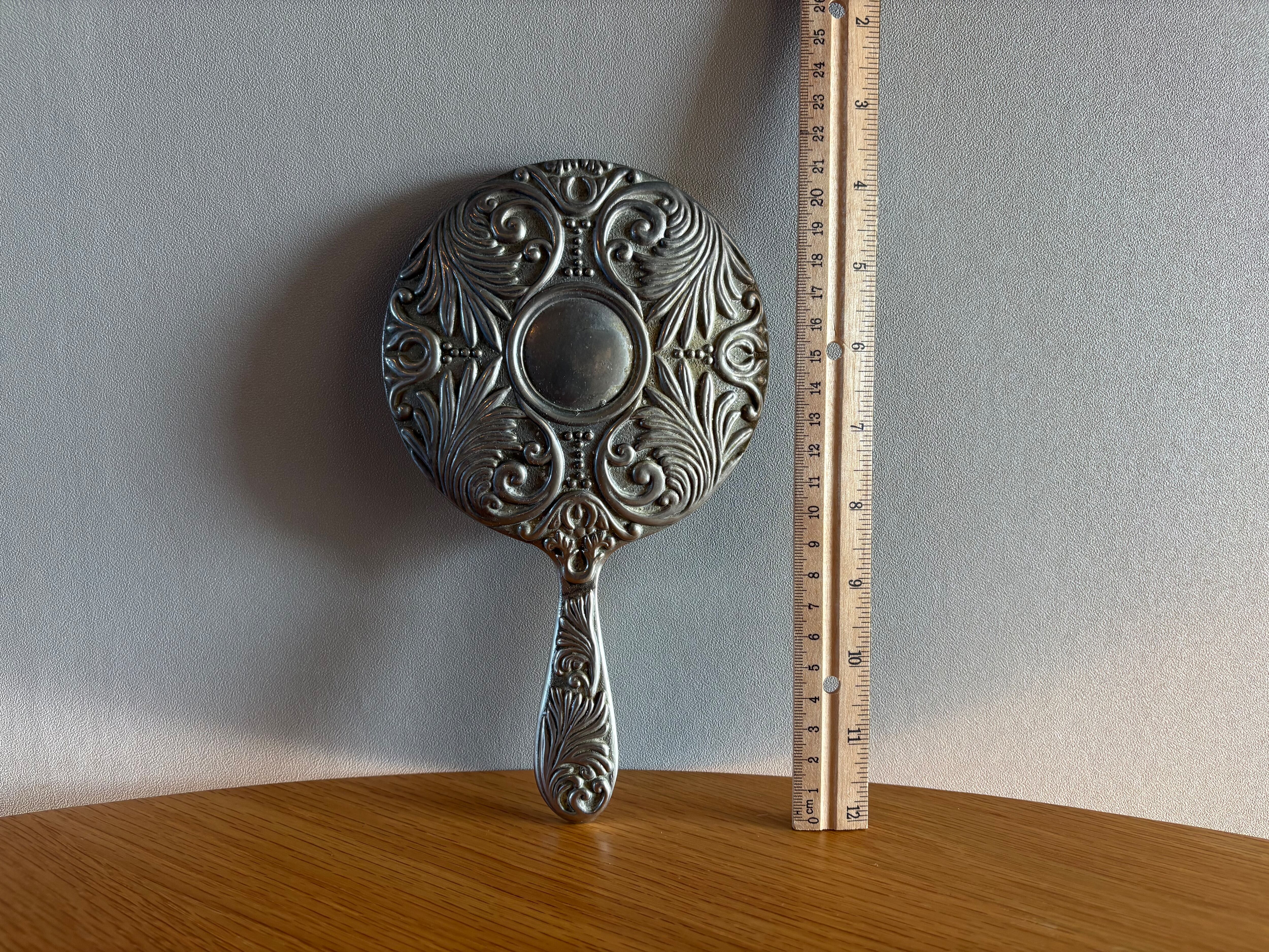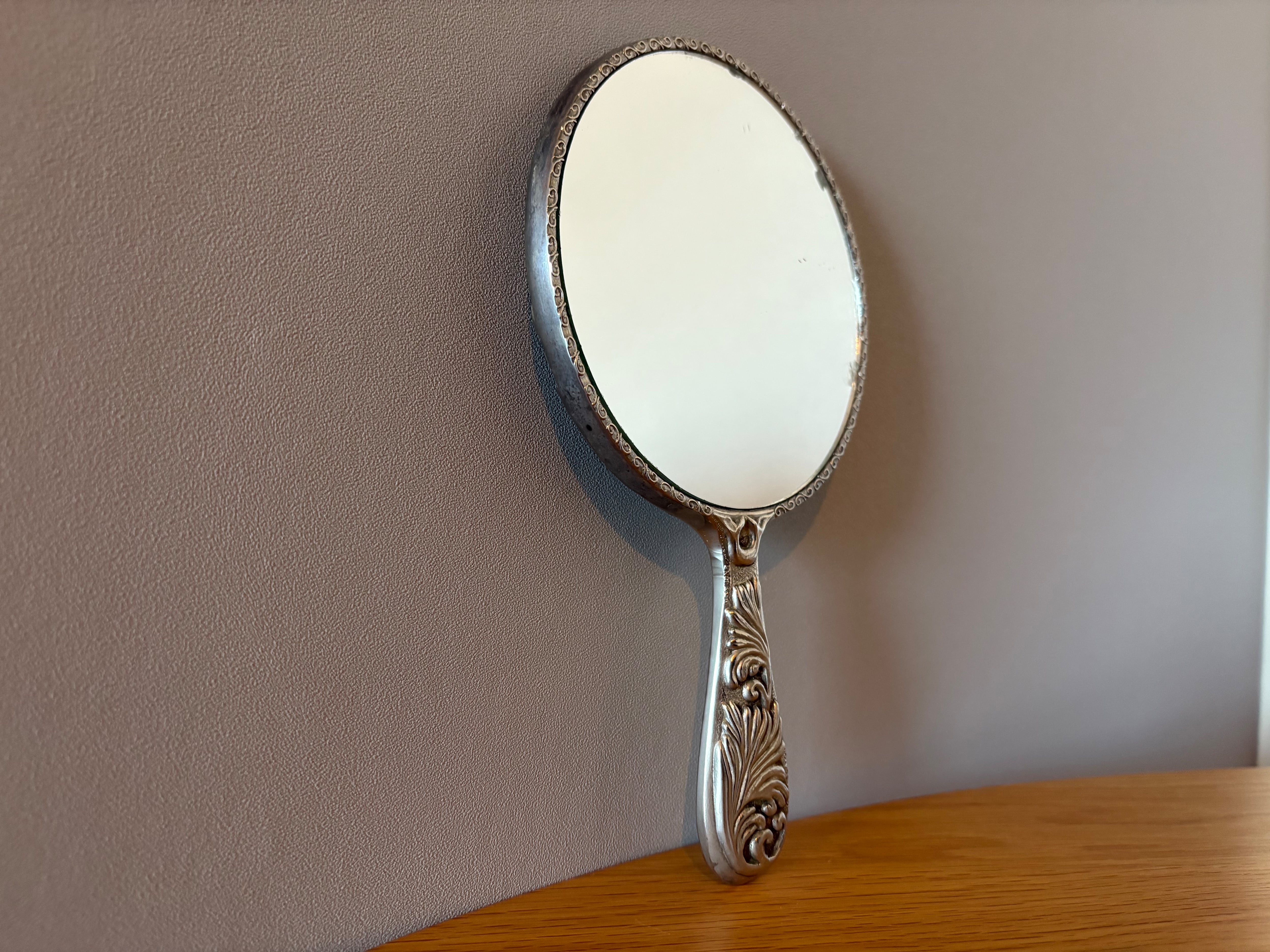 経年によるくすみや細かな擦れが見られますが、アンティークならではの深い風合いとしてお楽しみいただけます。鏡面は日常使用には問題のない程度で、映りは良好です。