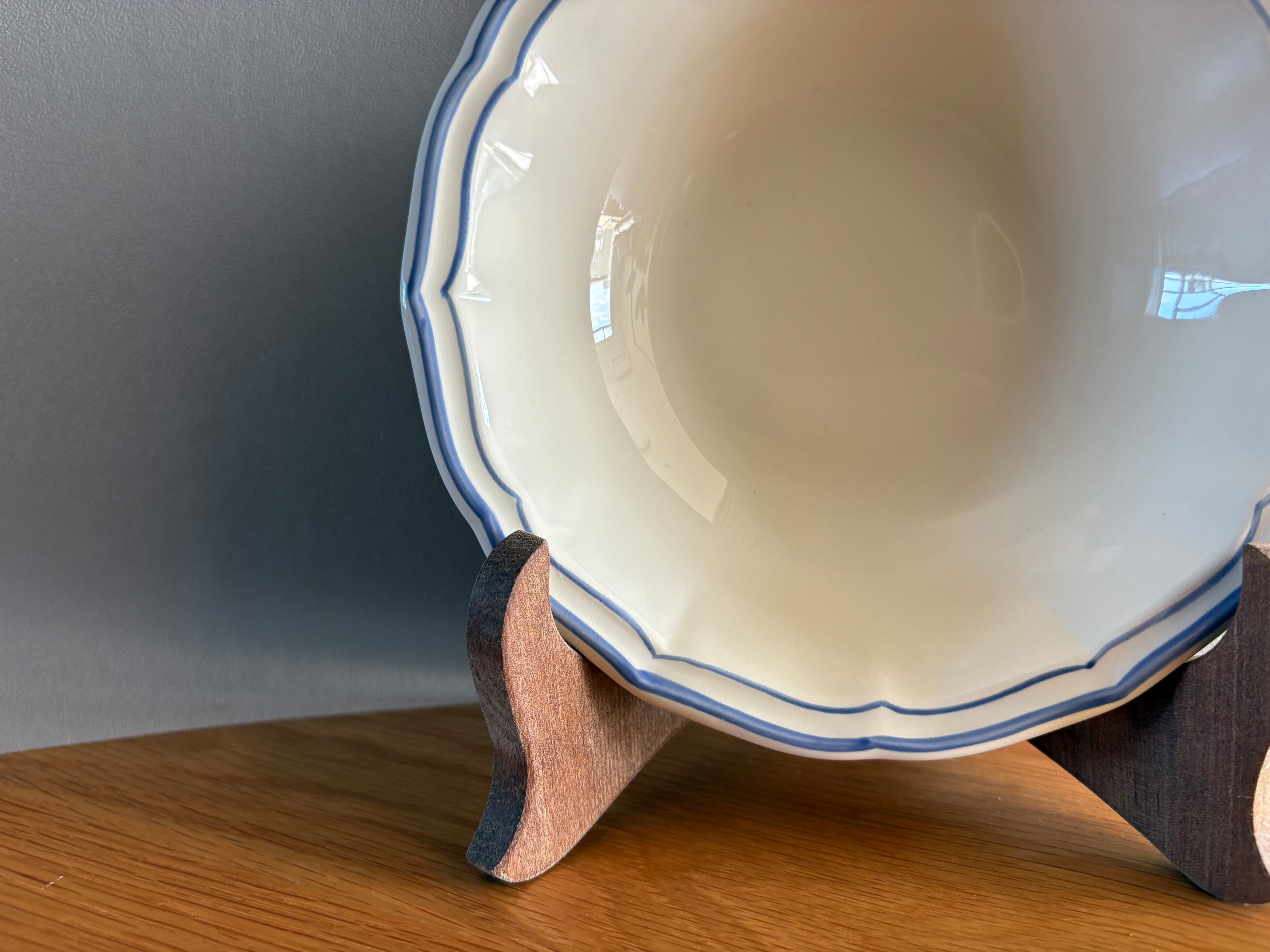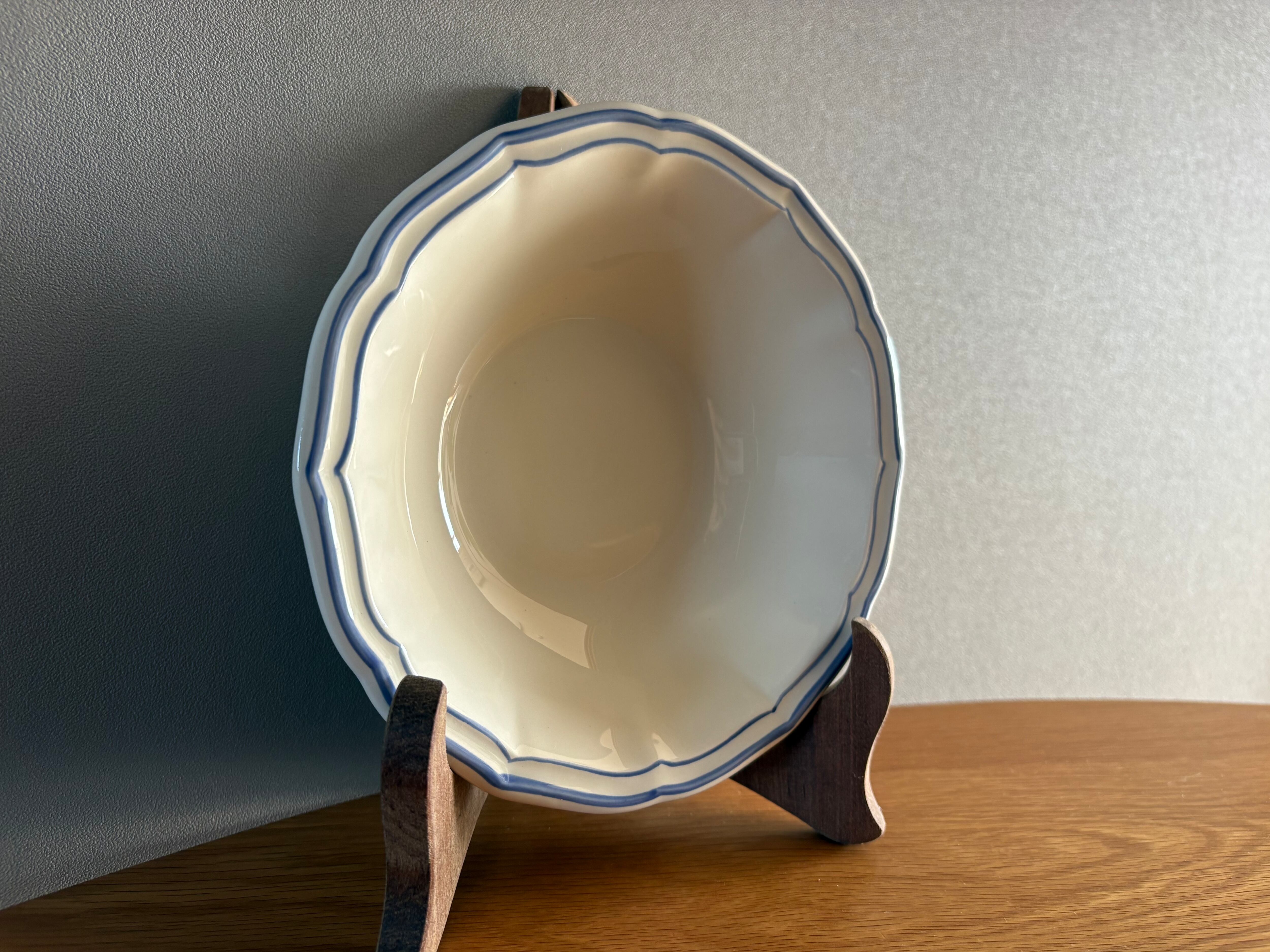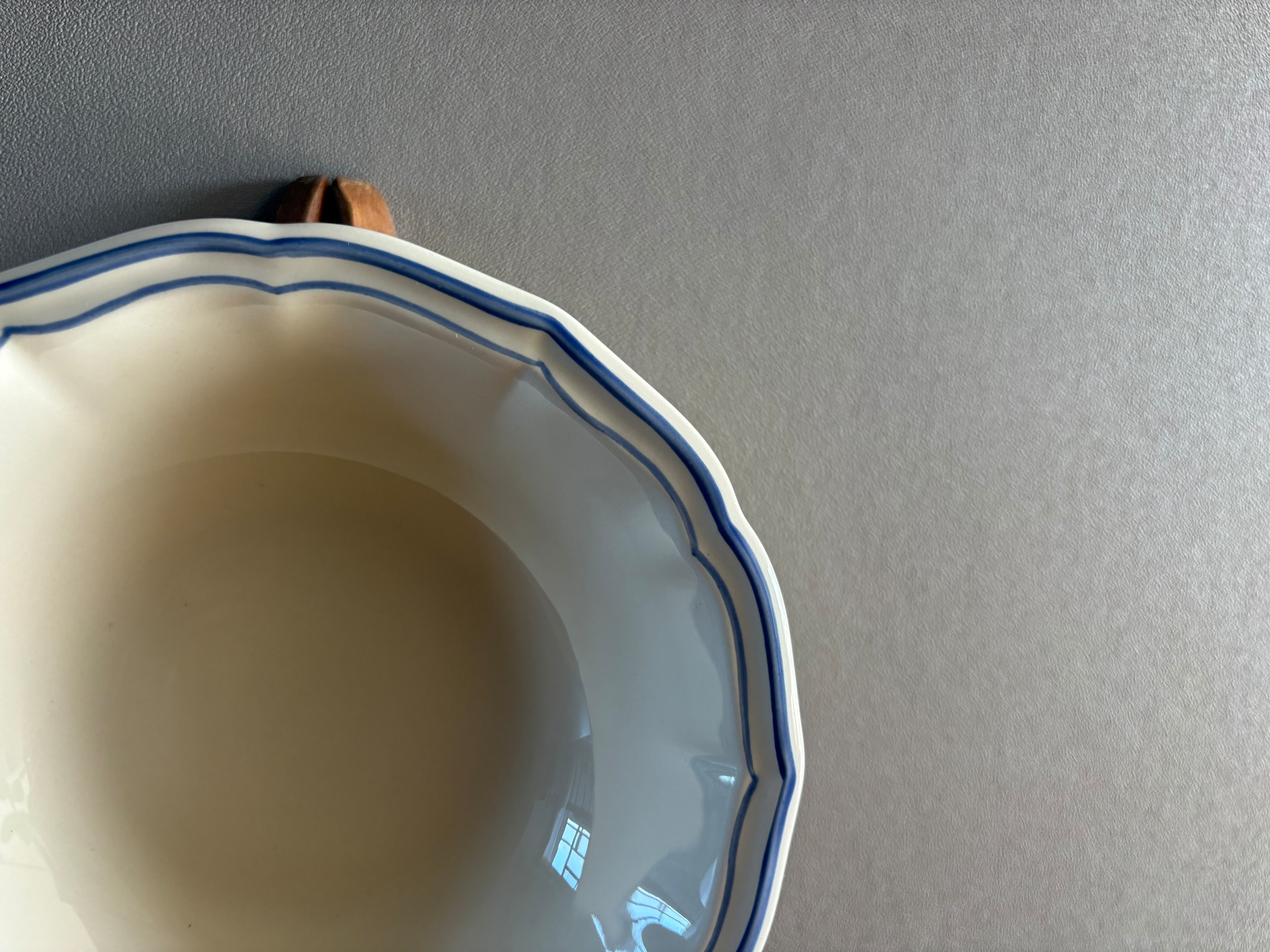 ゆるやかに波打つリムと、ほどよく立ち上がりのあるフォルムが、フランスの古い食卓を思わせる上品な佇まいです。