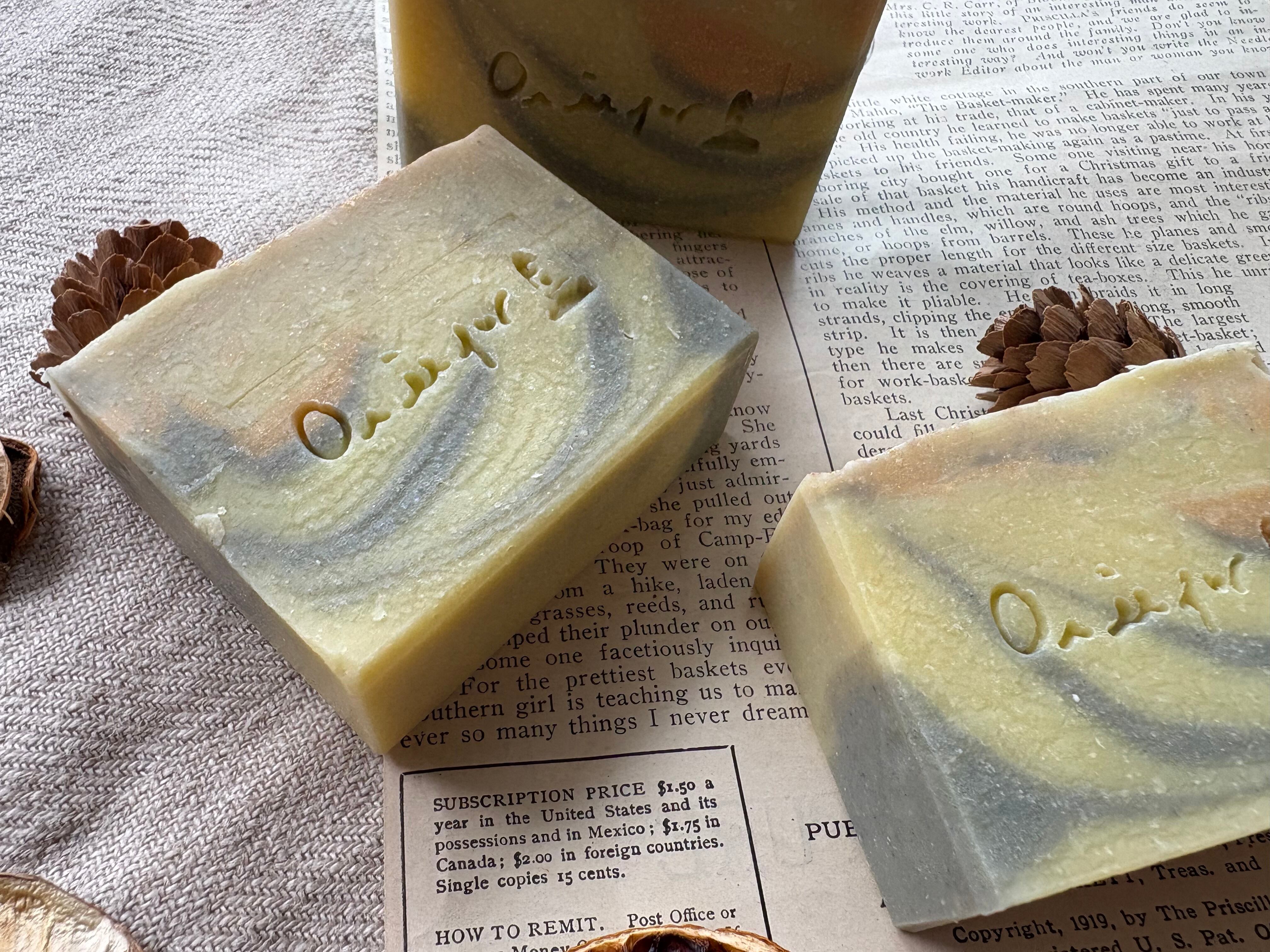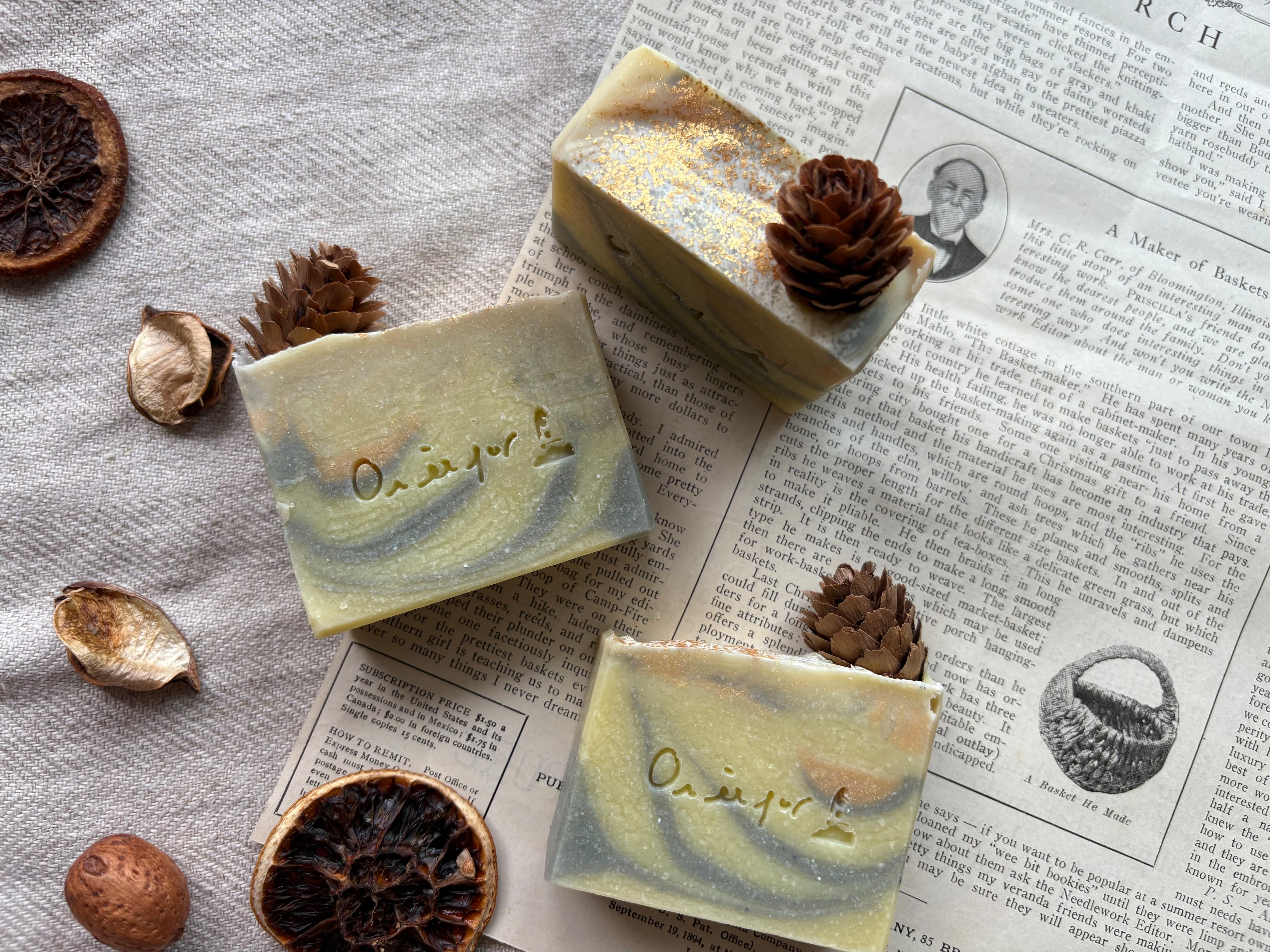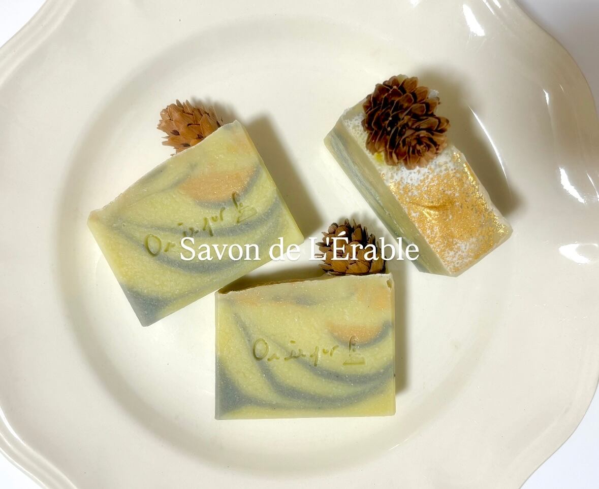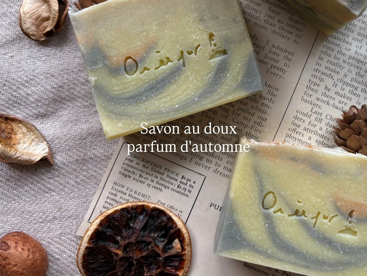 秋をイメージしたイエローベースな色合い、秋の香り(栗のような香り)のアロマオイルをブレンドしほのかに甘くスパイシーな香りの石鹸となっております。