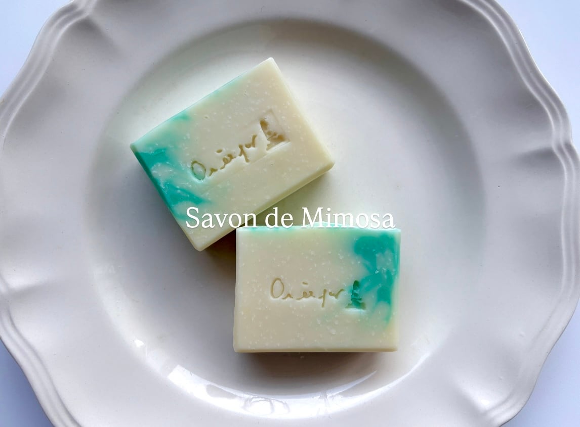 オリーブオイル、ココナッツオイル、パームオイル、ツバキオイル、アボカドオイル、ゴールデンホホバオイル、アルガンオイル、ヒマシオイル、ライスブランオイル、アンズ核油、ラベンダー油、スクラワン、マヨナラ葉油、水酸化ナトリウム、精製水、フレンチクレイ(イエロークレイ)グリーンパールマイカ、精油(ミモザ)