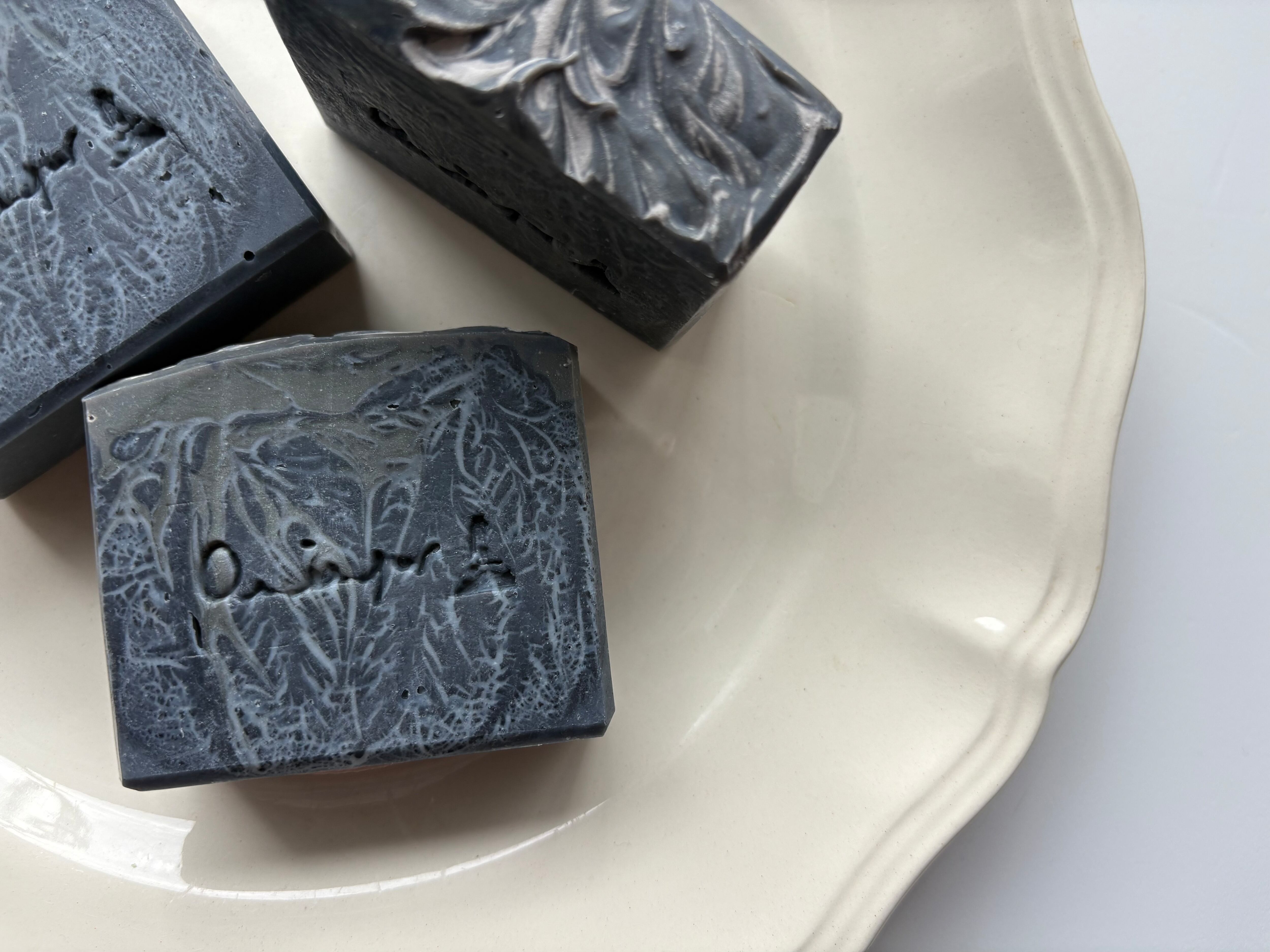 オリーブオイル、ココナッツオイル、パームオイル、ツバキオイル、アルガンオイル、ゴールデンホホバオイル、カレンデュラオイル、ラズベリーシードオイル、ヒマシオイル、アボカドオイル、スウィートアーモンドオイル、シアバター、水酸化ナトリウム、精製水、精油、竹炭パウダー、ダークグリーンパールマイカ