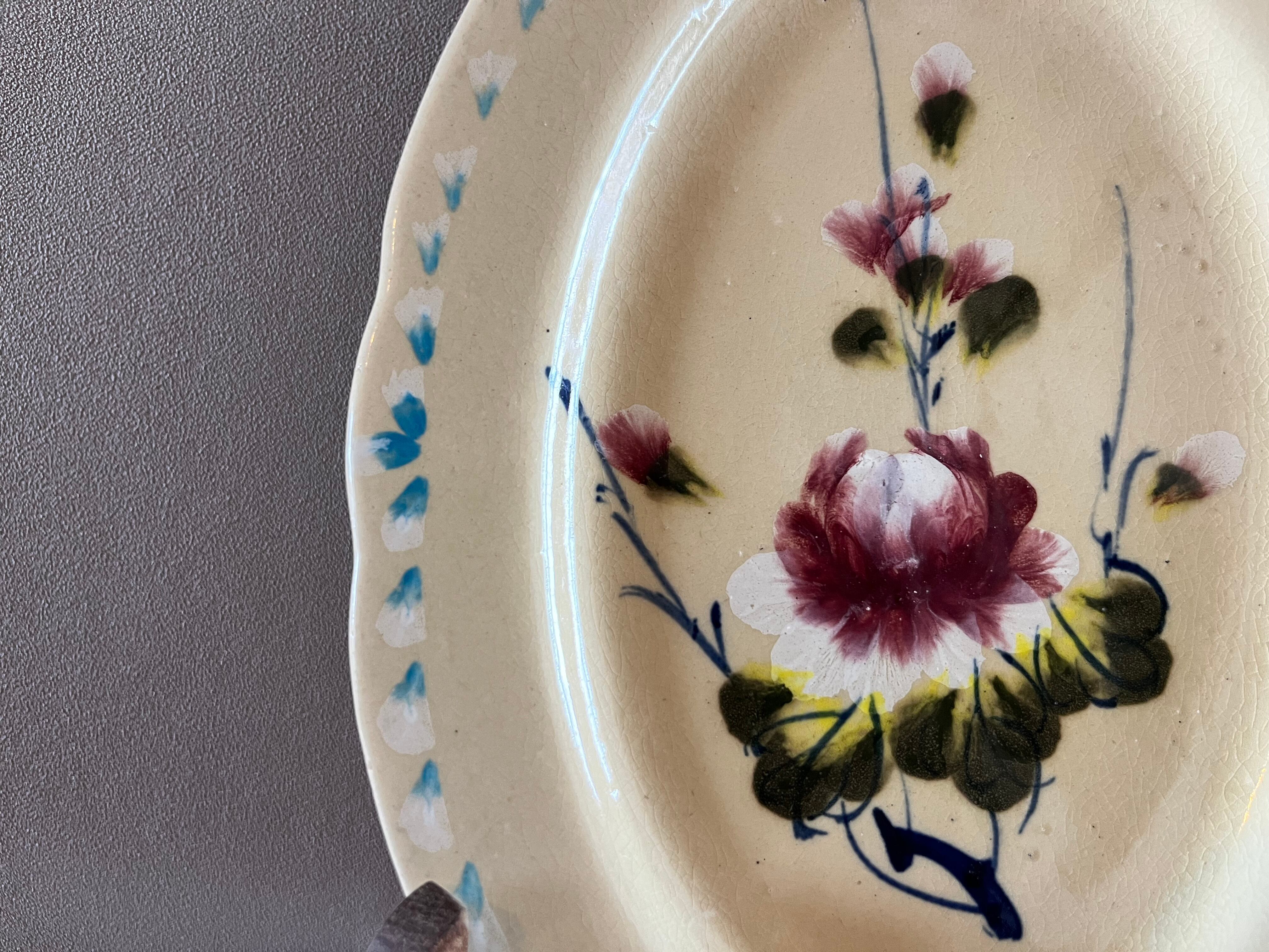ベトナムの旧ソンべ省(現ビンズオン省)で作られていた幻の民芸皿「ソンべ焼き」。一枚一枚手描きで絵付けされているため素朴ながらも繊細で、オリジナリティのある器です。花が描かれた高貴な美しい中皿オーバルプレートです。